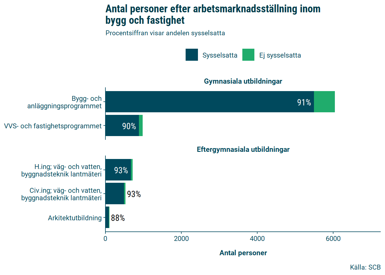 Arbetsförmedlingen bedömer i sina yrkesprognoser att byggnads- och ventilationsplåtslagare, golvläggare, murare och plattsättare, målare, ställningsbyggare, snickare, VVS montörer, betongarbetare, civilingenjörer, kyl- och värmepumpstekniker och takmontörer har mycket stora möjligheter till arbete fram till 2026, medan fastighetsskötare, anläggningsarbetare och anläggningsmaskinförare bedöms ha stora möjligheter till arbete fram till 2026 (Arbetsförmedlingen, 2024).