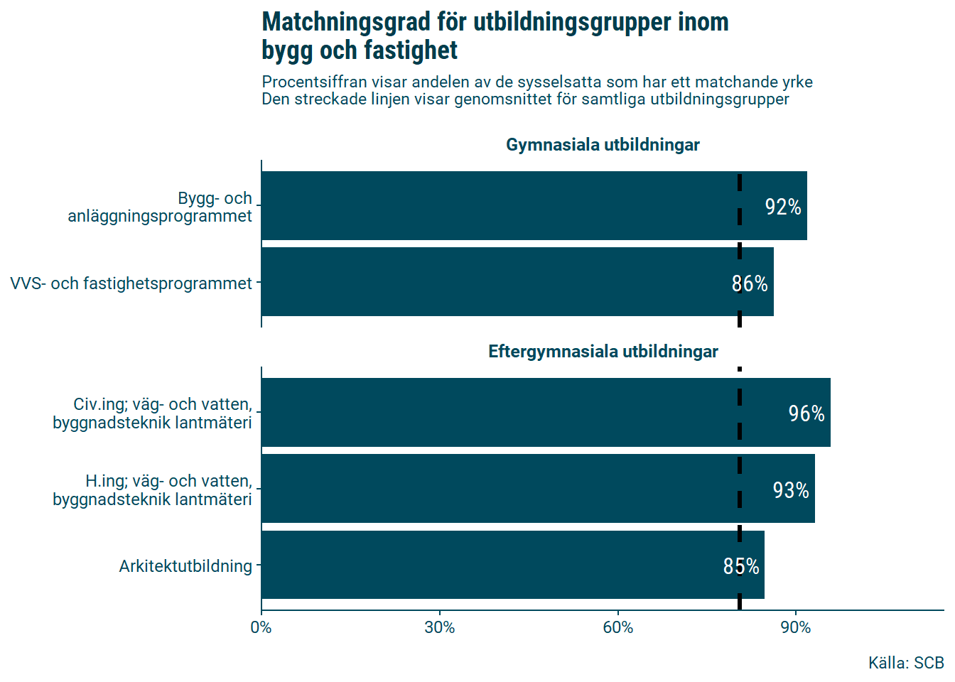 Matchningsgraden visar hur stor andel av de som är sysselsatta som har ett arbete som helt eller delvis stämmer överens med deras utbildningsinriktning och utbildningsnivå. Måttet skiljer sig därför från sysselsättningsgrad som endast visar om en person har ett arbete eller inte. Matchningsgraden inom bygg och fastighet är 91.5 procent, vilket är en högre nivå än för samtliga utbildningsgrupper i länet (80.5 procent).