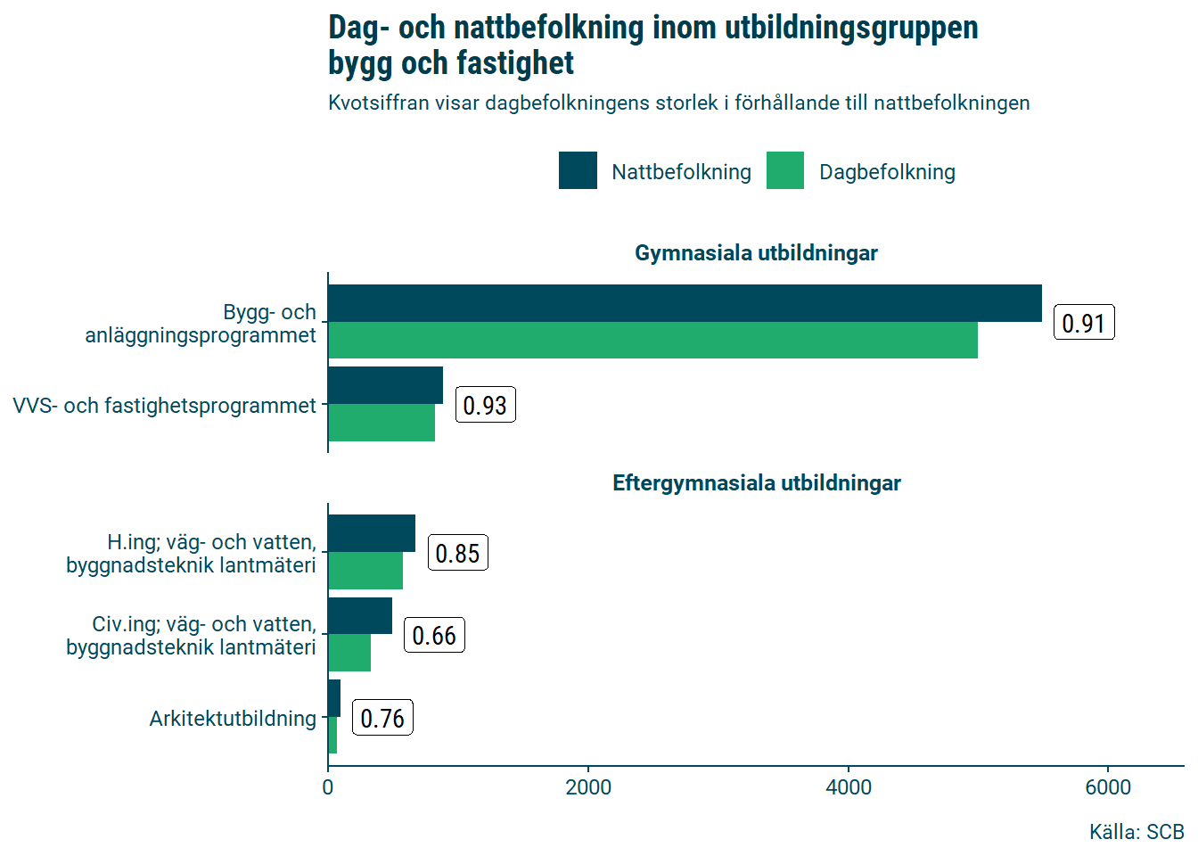 Den sysselsatta nattbefolkningen inom utbildningsområdet bygg och fastighet är 7624 personer, att jämföra med dagbefolkningen som är 6785 personer. Det betyder att det är färre som pendlar in till länet än som pendlar ut inom denna utbildningsgrupp.