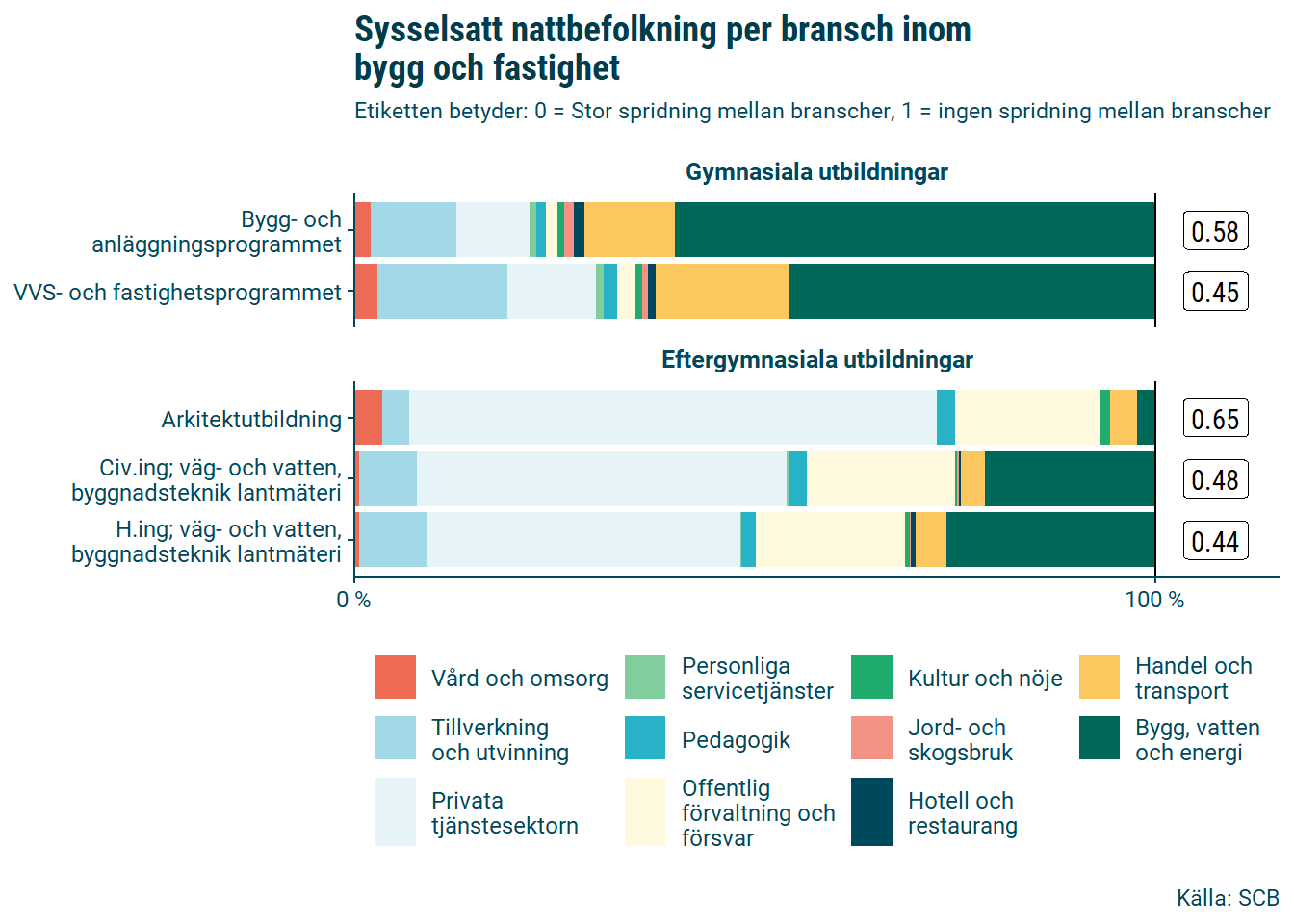 Olika utbildningsgrupper är verksamma inom olika branscher och beroende på vilken utbildning vi studerar varierar branschspridningen. En del utbildningar sprider sig över flera olika branscher medan andra är koncentrerade till ett fåtal. Att spridningen mellan branscherna varierar stort beror på en mängd olika faktorer.