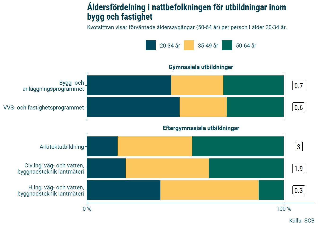 Bland personer med arkitektutbildning och byggnadsinriktad civilingenjörsutbildning är antalet förväntade pensionsavgångar fler än antalet unga med utbildningen.