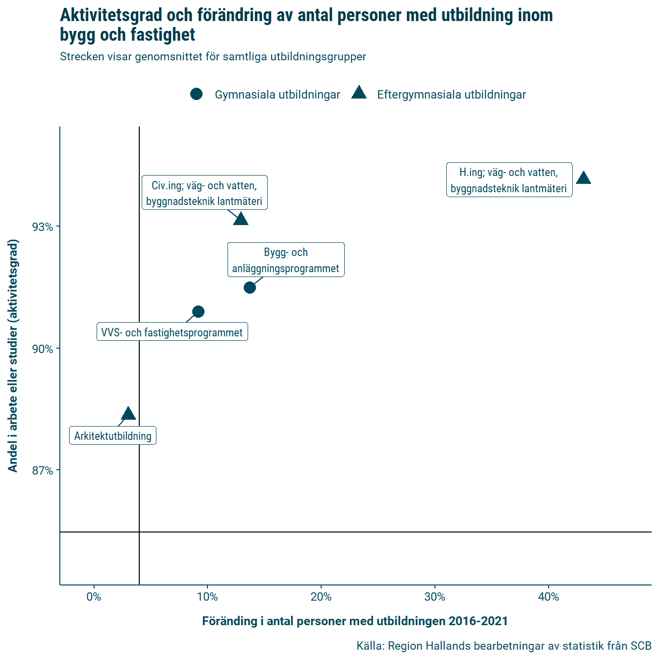 Det bor 8366 personer i Hallands län med en utbildning inom bygg och fastighet. Detta utgör 4.6 procent av alla personer mellan 20-64 år och som bor i regionen. Totalt är 91.1 procent av personerna i utildningsgruppen i sysselsättning. Detta är över genomsnittet (83.2 procent) för samtliga utbildningsgrupper i länet. I riket uppgår sysselsättningsgraden för utbildningsgruppen bygg och fastighet till 88.9 procent, detta innebär att gruppen har en bättre arbetsmarknadsställning i Hallands län än i riket som helhet.