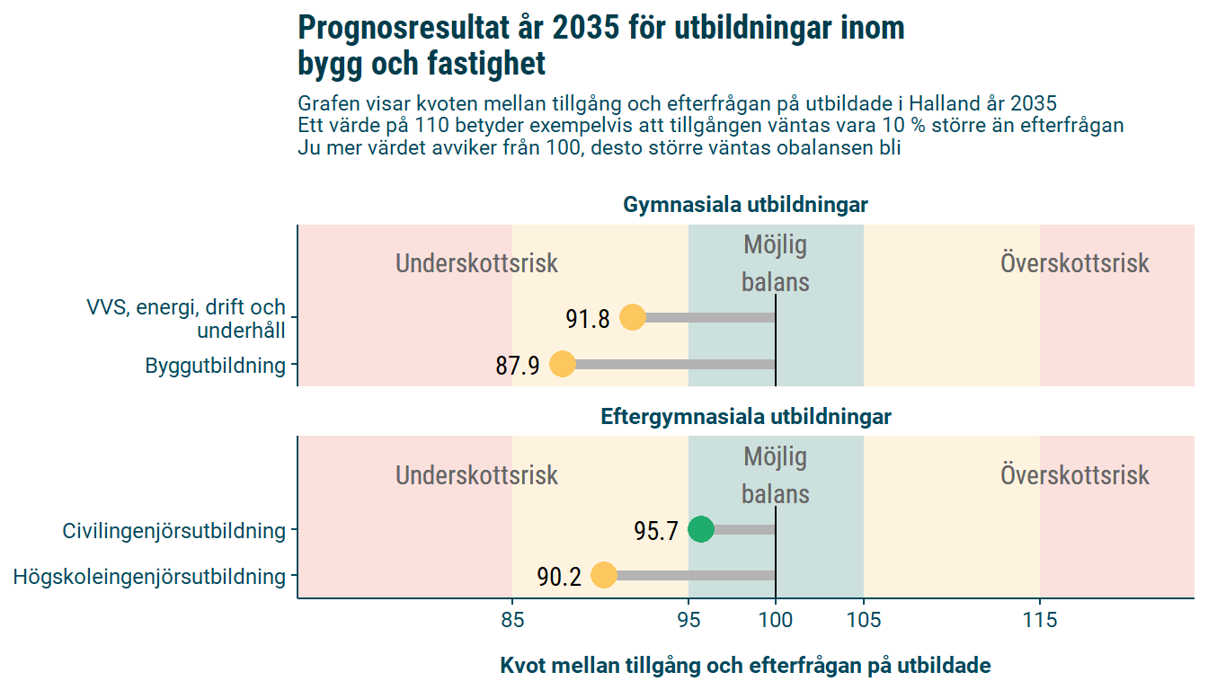 Under prognosperioden förväntas antalet personer med en gymnasial byggutbildning att öka med 29,5 procent samtidigt som efterfrågan ökar med hela 51,2 procent. Utvecklingen innebär att det riskerar att råda ett påtagligt underskott på gruppen 2035. En liknande utveckling väntas för personer med en gymnasial utbildning inom VVS, energi, drift och underhåll. Tillgången på denna grupp prognosticeras att öka med 38,2 procent och efterfrågan med hela 53,4 procent. Vid slutet av prognosperioden finns det därför risk för underskott på gruppen.