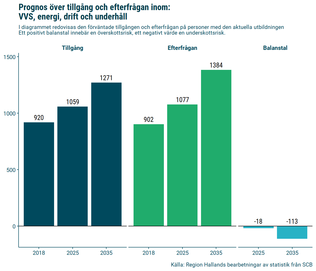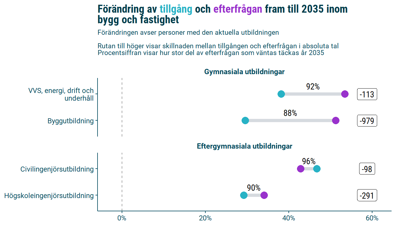 2035 bedöms det finnas risk för brist inom hela fältet, men framförallt på gymnasialt utbildade inom bygg, VVS, energi, drift och underhåll.