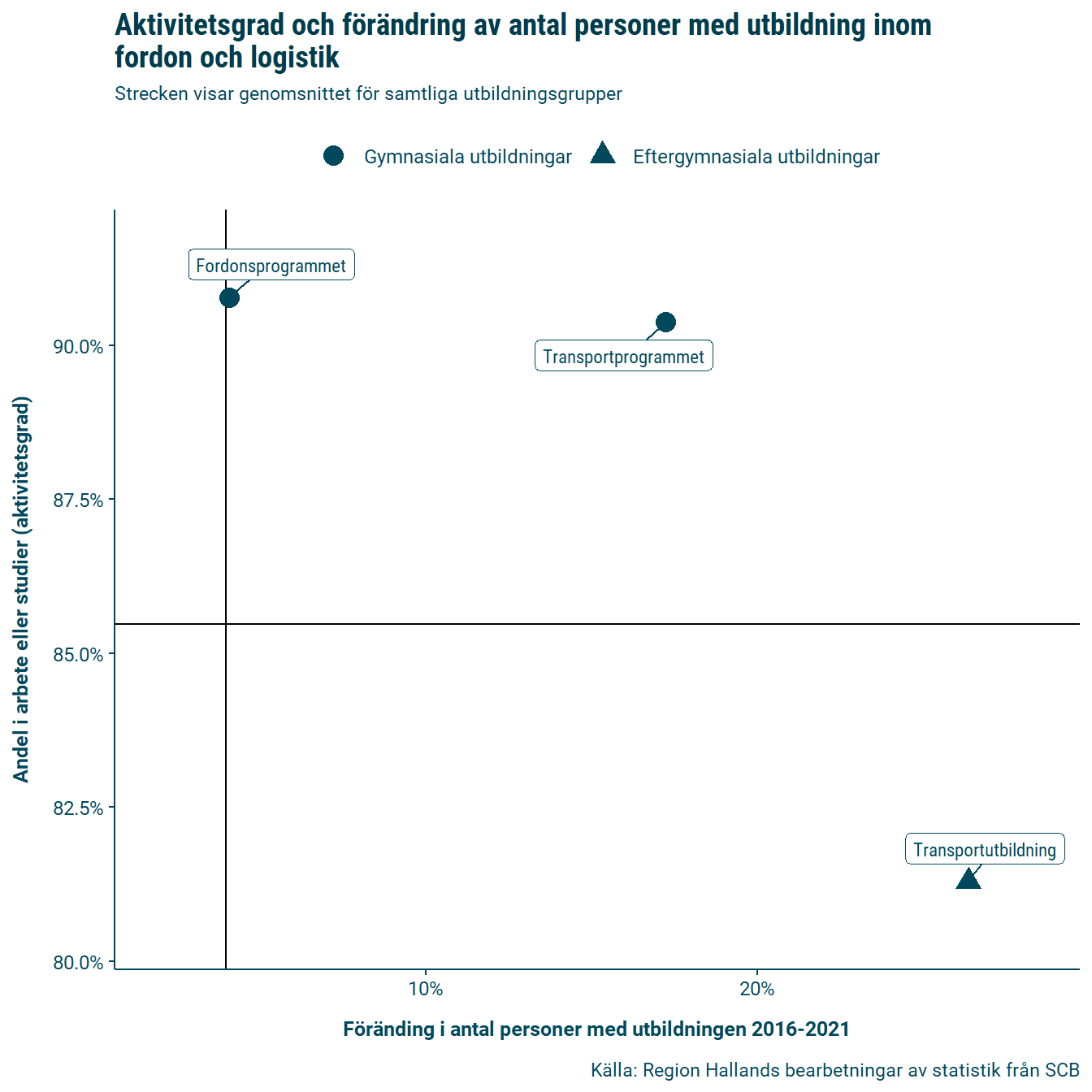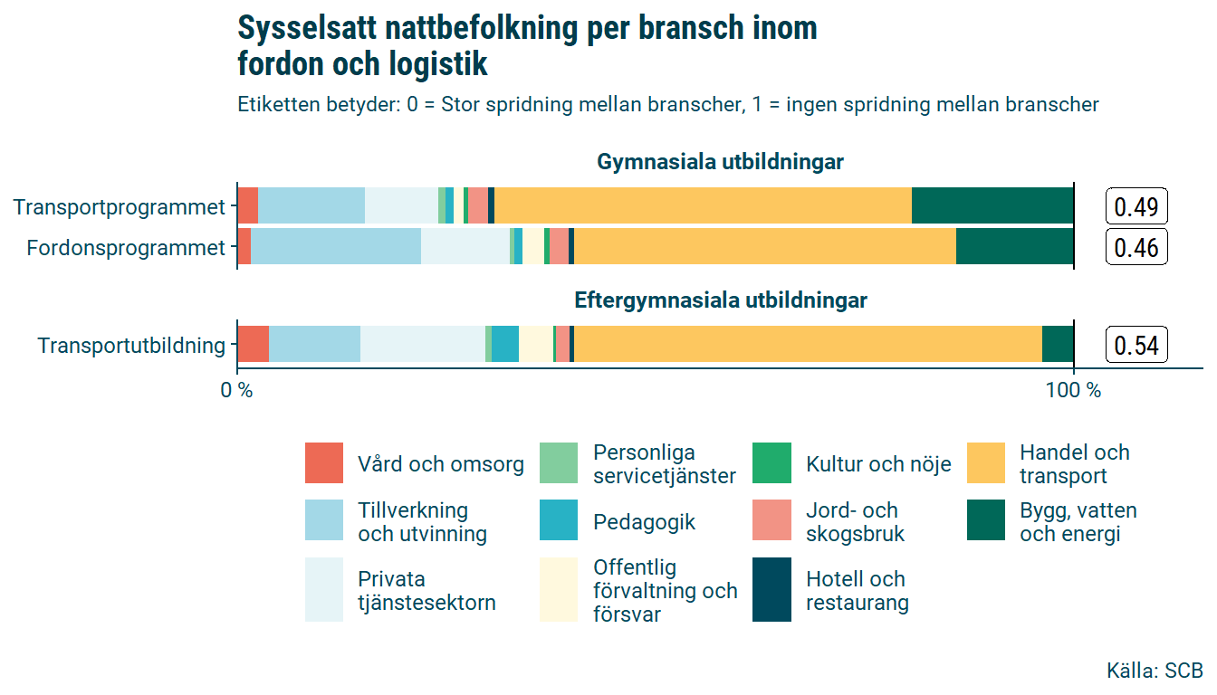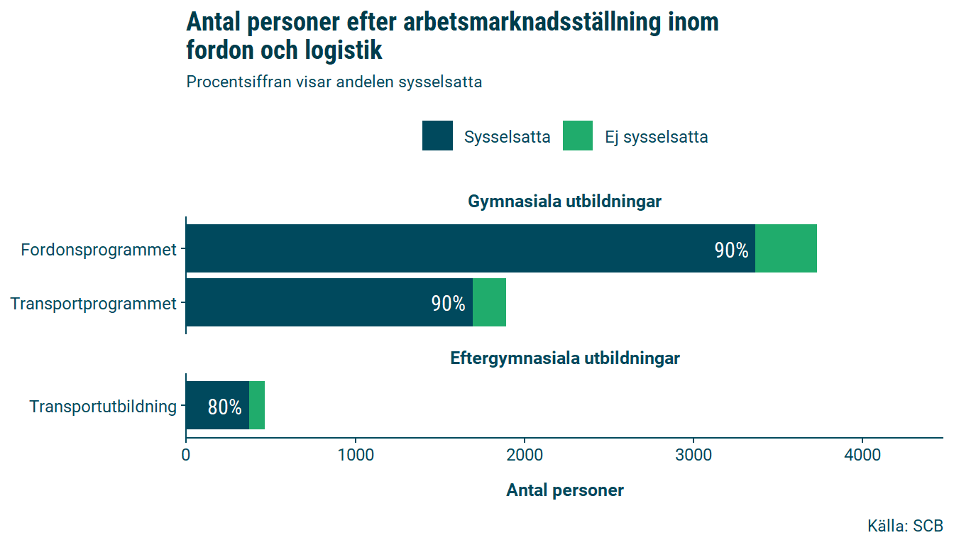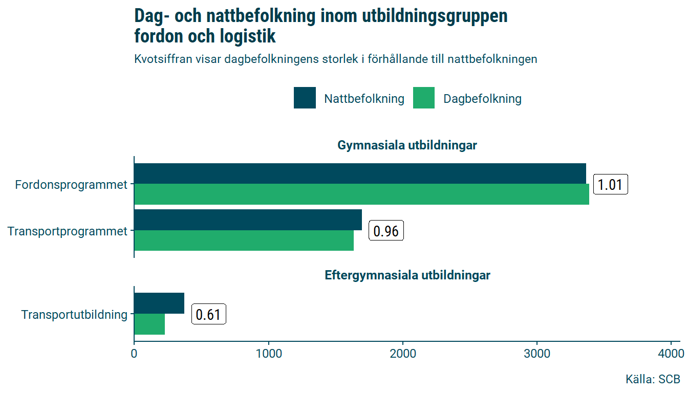 Den sysselsatta nattbefolkningen inom utbildningsområdet fordon och logistik är 5434 personer, att jämföra med dagbefolkningen som är 5251 personer. Det betyder att det är färre som pendlar in till länet än som pendlar ut inom denna utbildningsgrupp.