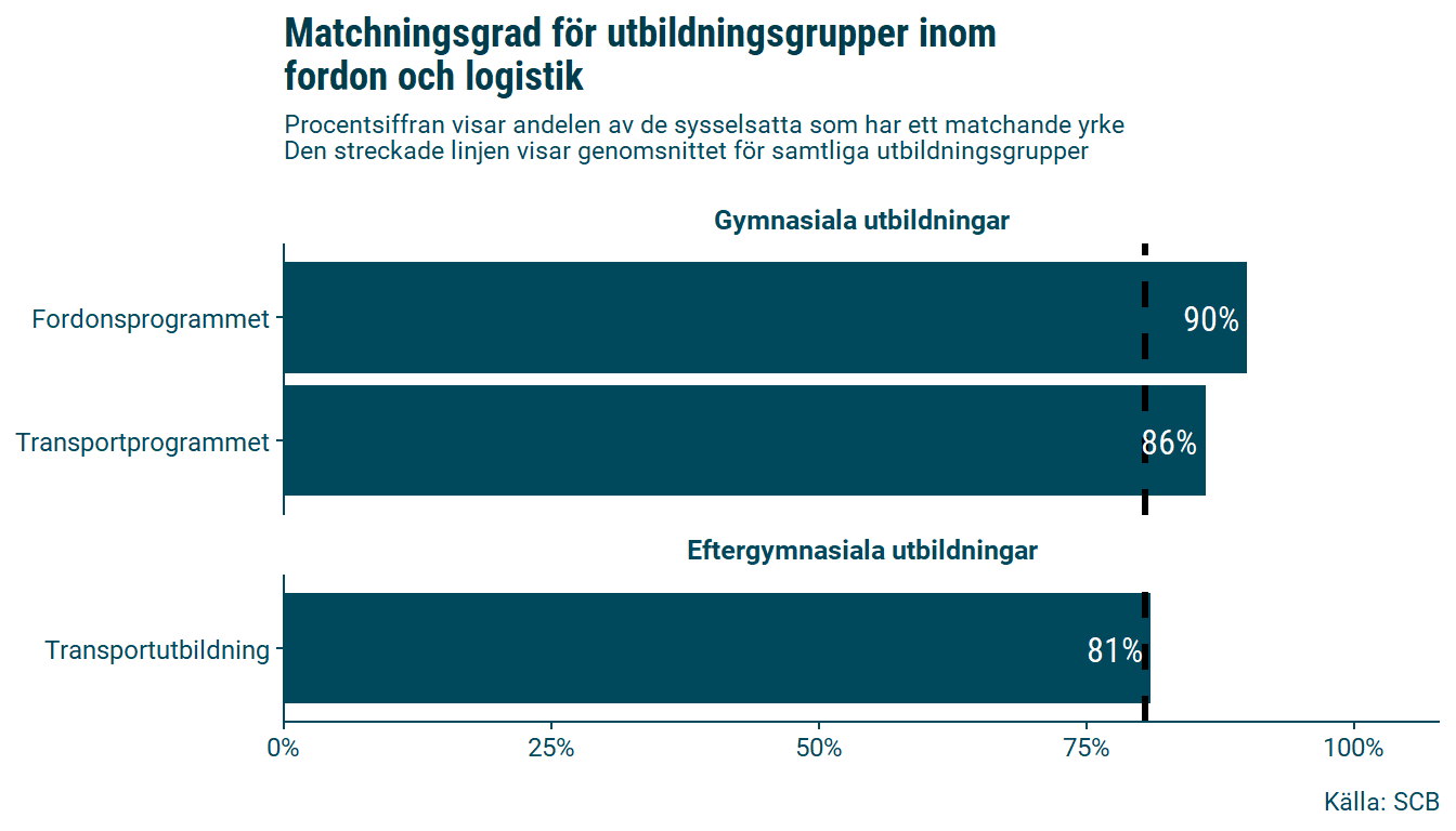 Matchningsgraden visar hur stor andel av de som är sysselsatta som har ett arbete som helt eller delvis stämmer överens med deras utbildningsinriktning och utbildningsnivå. Måttet skiljer sig därför från sysselsättningsgrad som endast visar om en person har ett arbete eller inte. Matchningsgraden inom fordon och logistik är 88.2 procent, vilket är en högre nivå än för samtliga utbildningsgrupper i länet (80.5 procent).