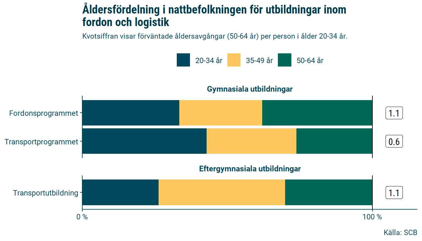 Bland personer med eftergymnasial transportutbildning och gymnasial fordonsutbildning är antalet förväntade pensionsavgångar fler än antalet unga med utbildningen.