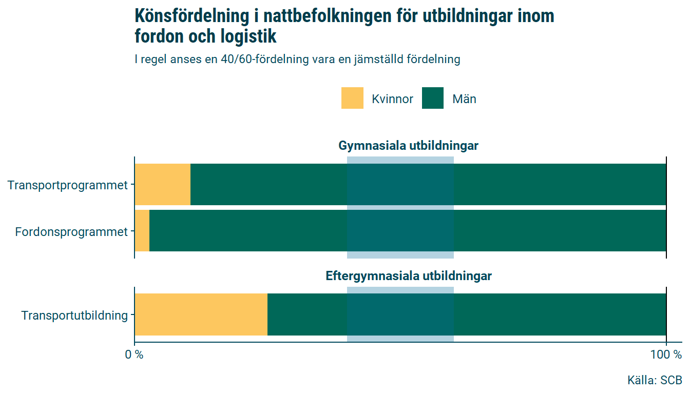 Överlag är män överrepresenterade inom tekniska utbildningar och gymnasiala yrkesutbildningar med inriktning mot bygg, industri eller fordon, och kvinnor är överrepresenterade inom utbildningar med inriktning mot vård och pedagogik. Könsfördelningen är som jämnast inom utbildningar inom samhällsvetenskap och ekonomi.