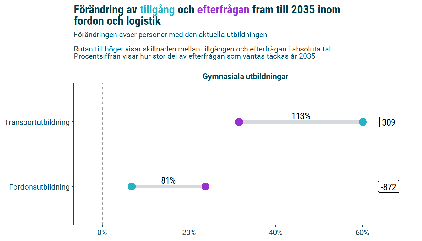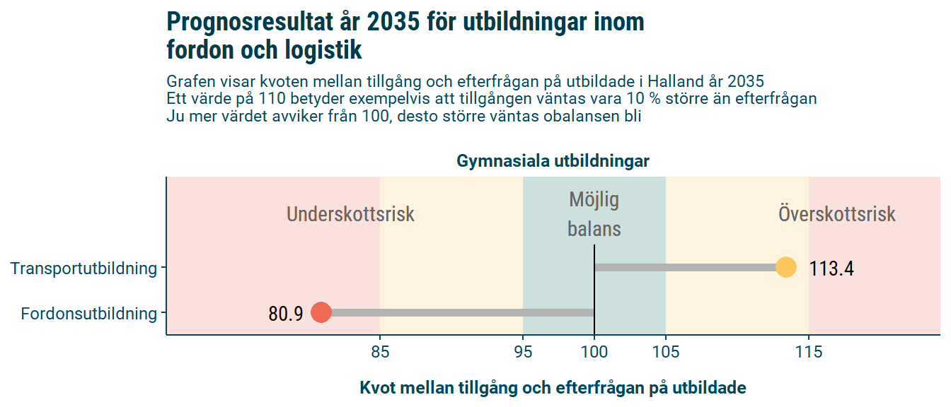 2035 bedöms det finnas risk för brist på personer med gymnasial fordonsutbildning. Det finns risk för överskott på personer med transportutbildning.