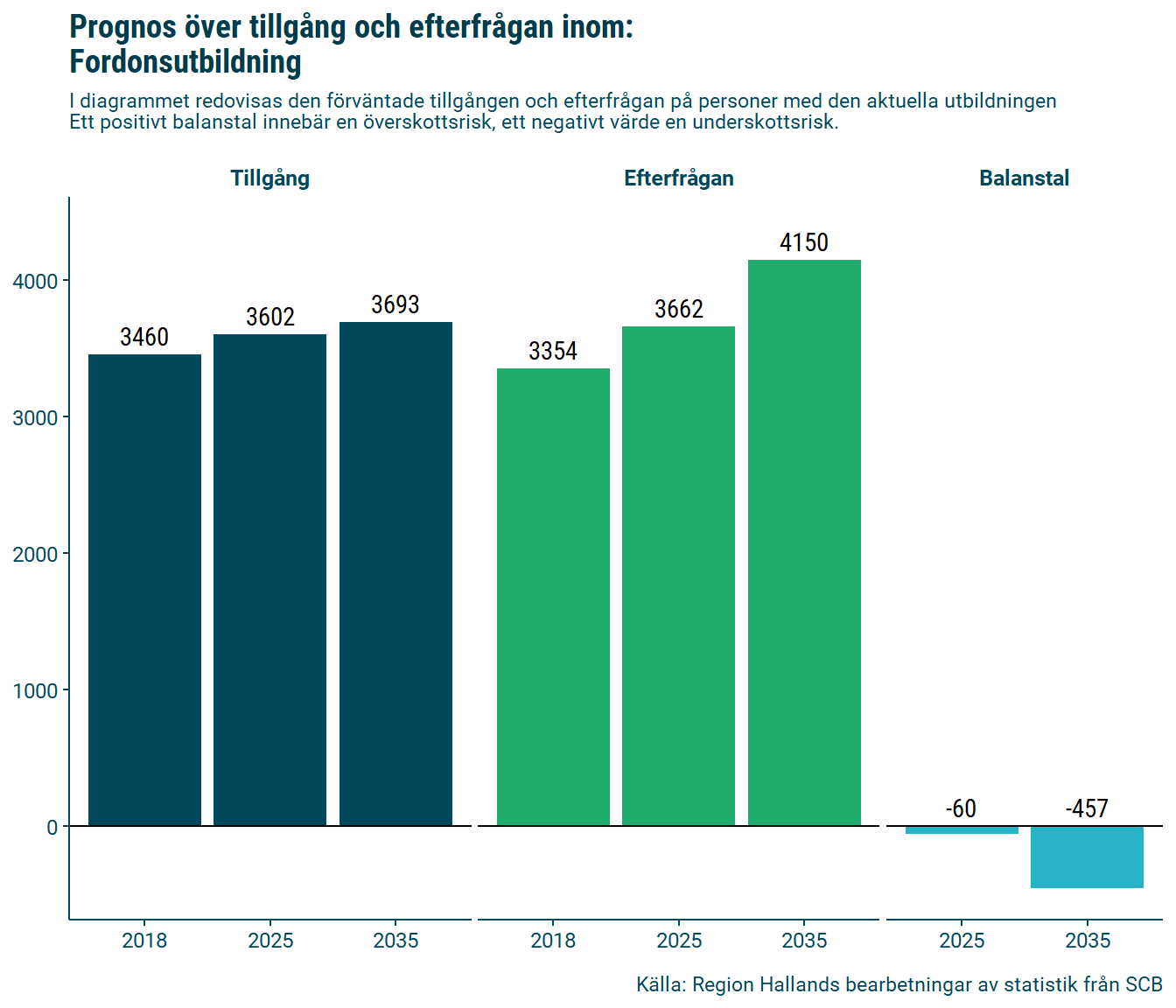 I graferna nedan visas detaljerade prognosresultat för utbildningarna inom fordon och logistik avseende tillgång, efterfrågan och balanstal mellan de två komponenterna fram till 2035.