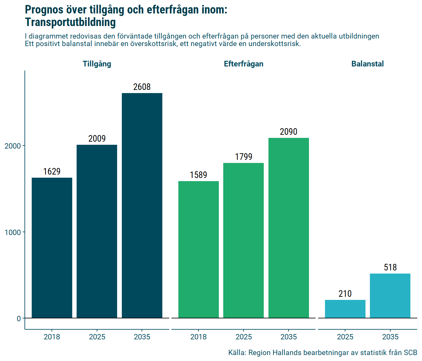 Statistiska centralbyrån (SCB) har på uppdrag av Sveriges regioner och Tillväxtverket tagit fram regionala utbildningsprognoser för samtliga län i Sverige. Prognoserna levererades i april månad 2022 och sträcker sig fram till 2035. Huvudsyftet med prognoserna är att ge en bild över vilka utbildningsgrupper det kan komma att råda balans, brist eller överskott på år 2035. Prognosmodellen består av en tillgångsdel och en efterfrågedel. Tillgångsprognosen ger tillgången på utbildade som står till arbetsmarknadens förfogande i länet och efterfrågeprognosen ger arbetsmarknadens totala efterfrågan per utbildningsgrupp i länet.