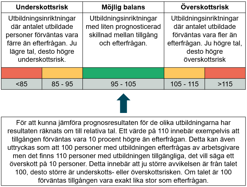 Med möjlig balans avses utbildningsinriktningar där avståndet mellan den förväntade tillgången och den förväntade efterfrågan är relativt litet (max 5 procent avvikelse i negativ eller positiv riktning). Ett värde på 100 innebär att utbudet förväntas att vara lika stor som efterfrågan 2035. Ju längre bort en utbildningsinriktning är från talet 100, oavsett om avvikelsen är positiv eller negativ, desto större är den förväntade obalansen mellan tillgång och efterfrågan 2035.