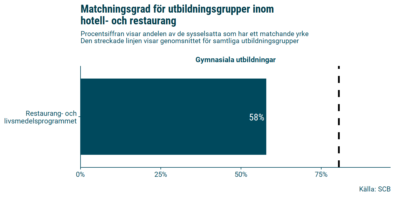Matchningsgraden visar hur stor andel av de som är sysselsatta som har ett arbete som helt eller delvis stämmer överens med deras utbildningsinriktning och utbildningsnivå. Måttet skiljer sig därför från sysselsättningsgrad som endast visar om en person har ett arbete eller inte. Matchningsgraden inom hotell- och restaurang är 57.9 procent, vilket är en lägre nivå än för samtliga utbildningsgrupper i länet (80.5 procent).