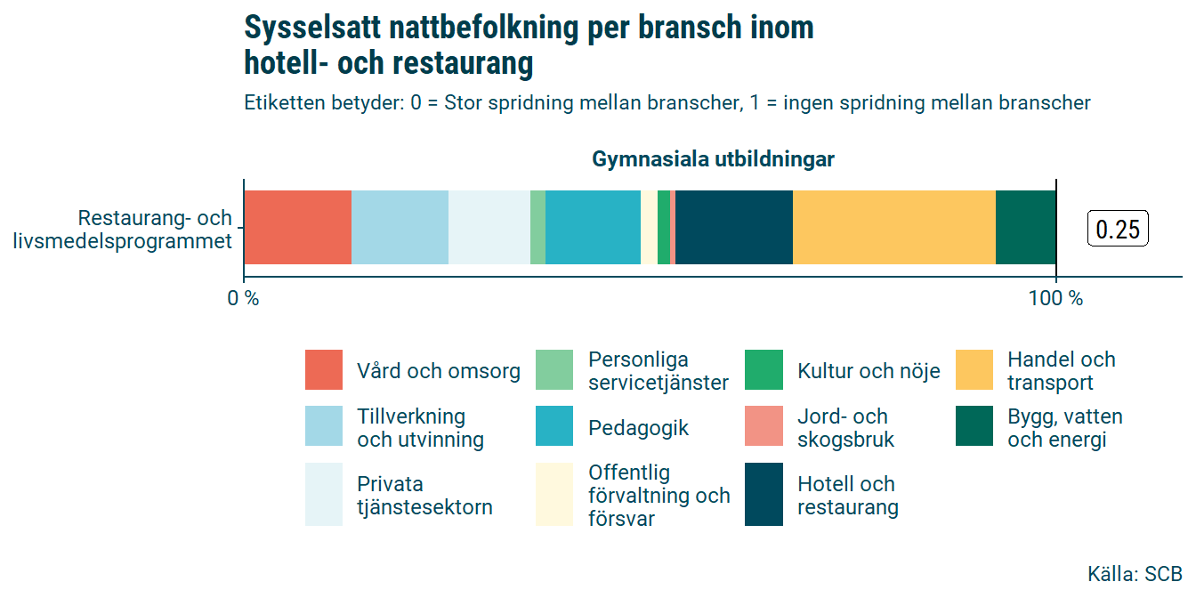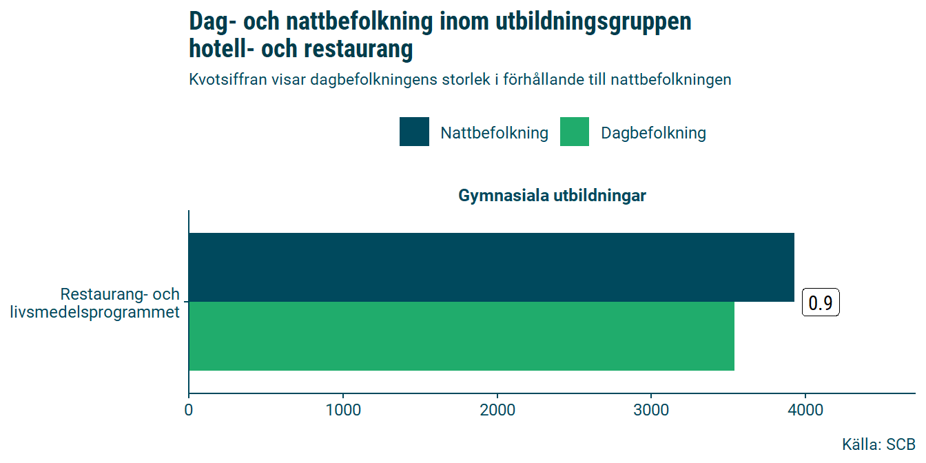Den sysselsatta nattbefolkningen inom utbildningsområdet hotell- och restaurang är 3928 personer, att jämföra med dagbefolkningen som är 3539 personer. Det betyder att det är färre som pendlar in till länet än som pendlar ut inom denna utbildningsgrupp.