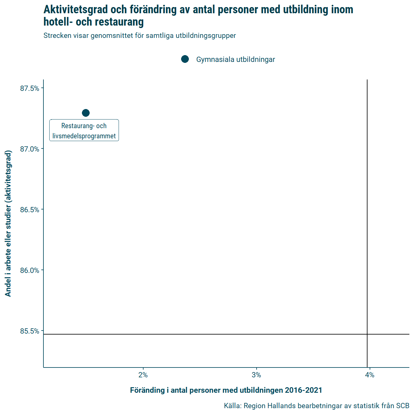 Det bor 4557 personer i Hallands län med en utbildning inom hotell- och restaurang. Detta utgör 2.5 procent av alla personer mellan 20-64 år och som bor i regionen. Totalt är 86.2 procent av personerna i utildningsgruppen i sysselsättning. Detta är över genomsnittet (83.2 procent) för samtliga utbildningsgrupper i länet. I riket uppgår sysselsättningsgraden för utbildningsgruppen hotell- och restaurang till 83.1 procent, detta innebär att gruppen har en bättre arbetsmarknadsställning i Hallands län än i riket som helhet.