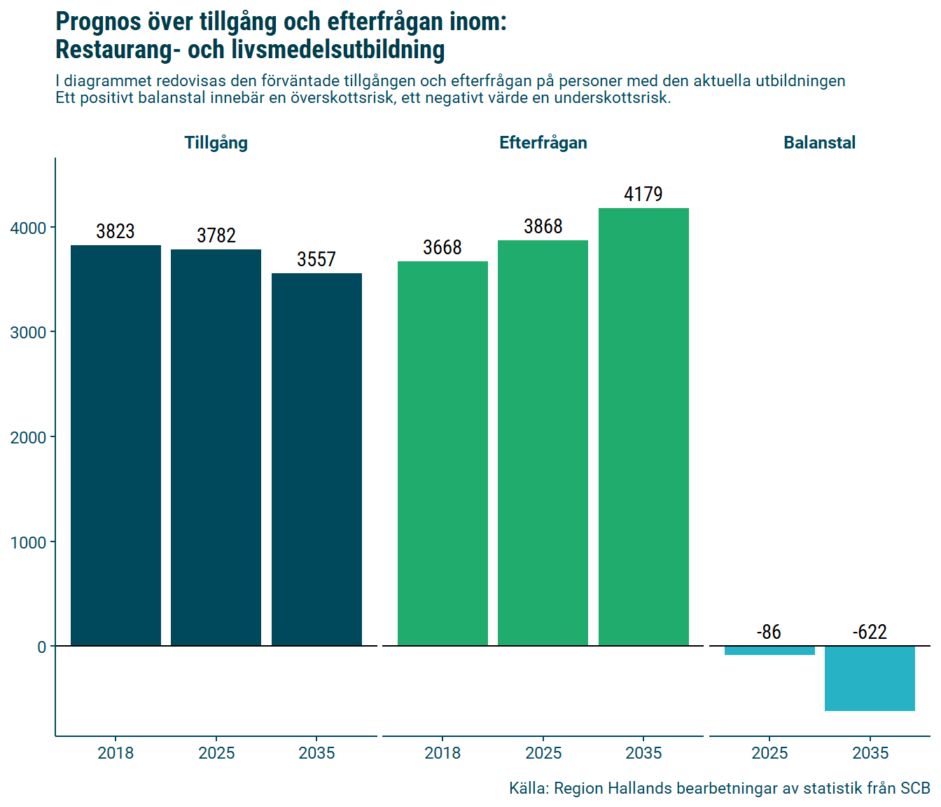 Under prognosperioden förväntas tillgången på personer med en restaurang- och livsmedelsutbildning att minska med 7 procent samtidigt som efterfrågan förväntas att öka med 13,9 procent. Till stora delar förklaras den ökade efterfrågeutvecklingen med att näringsgrenar som efterfrågar personal med utbildningen förväntas att växa mycket. Obalansen mellan efterfrågan och tillgången under perioden förväntas leda till en relativt omfattande brist på personal med en restaurang- och livsmedelsutbildning vid prognosperiodens slut.