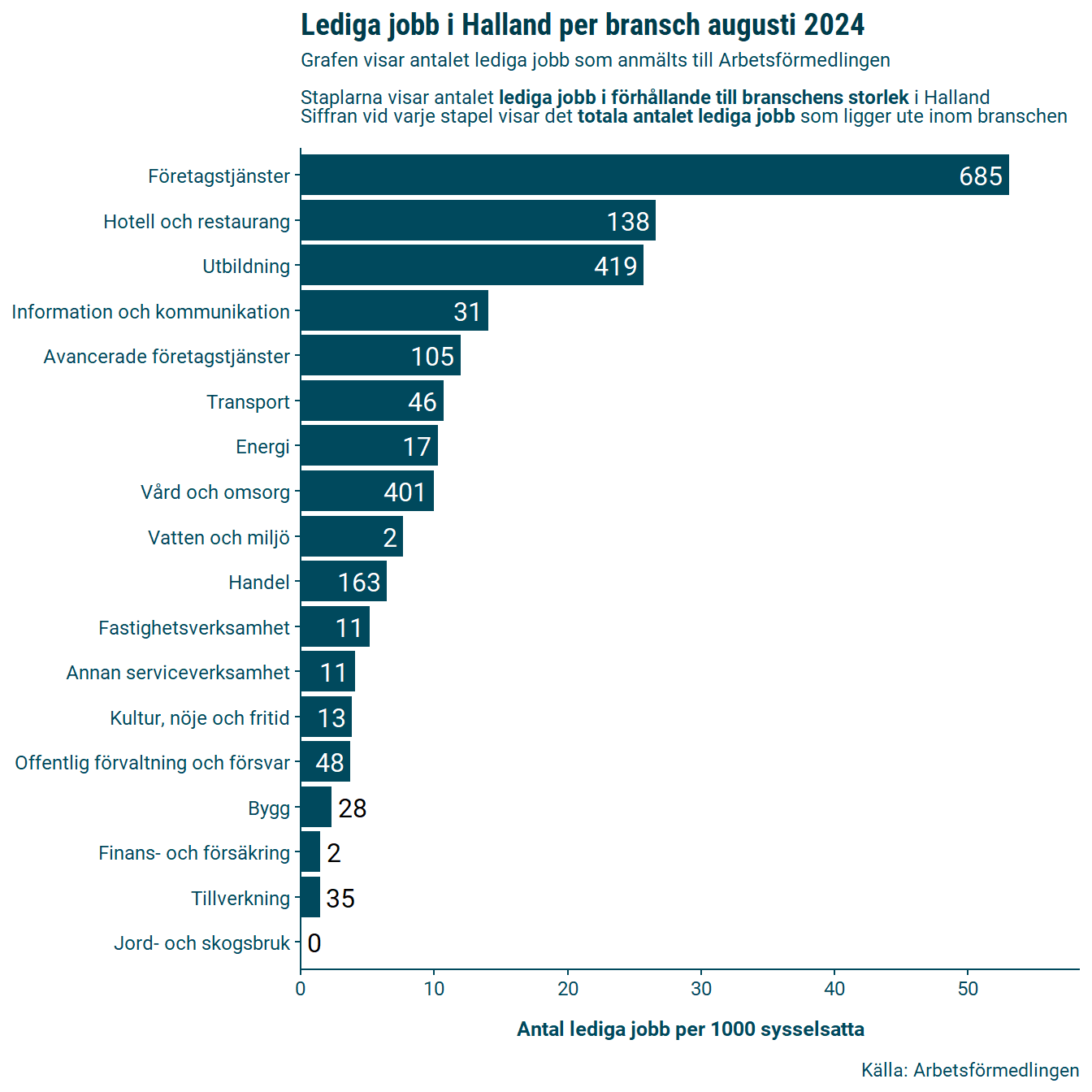 Flest antal lediga jobb finns inom branscherna företagstjänster, utbildning, samt vård och omsorg. Ställer vi antalet lediga jobb i relation till hur stora branscherna är i länet, d.v.s. hur många som är sysselsatta i branscherna, ser vi att den relativa efterfrågan är som störst inom företagstjänster, hotell och restaurang, samt utbildning.