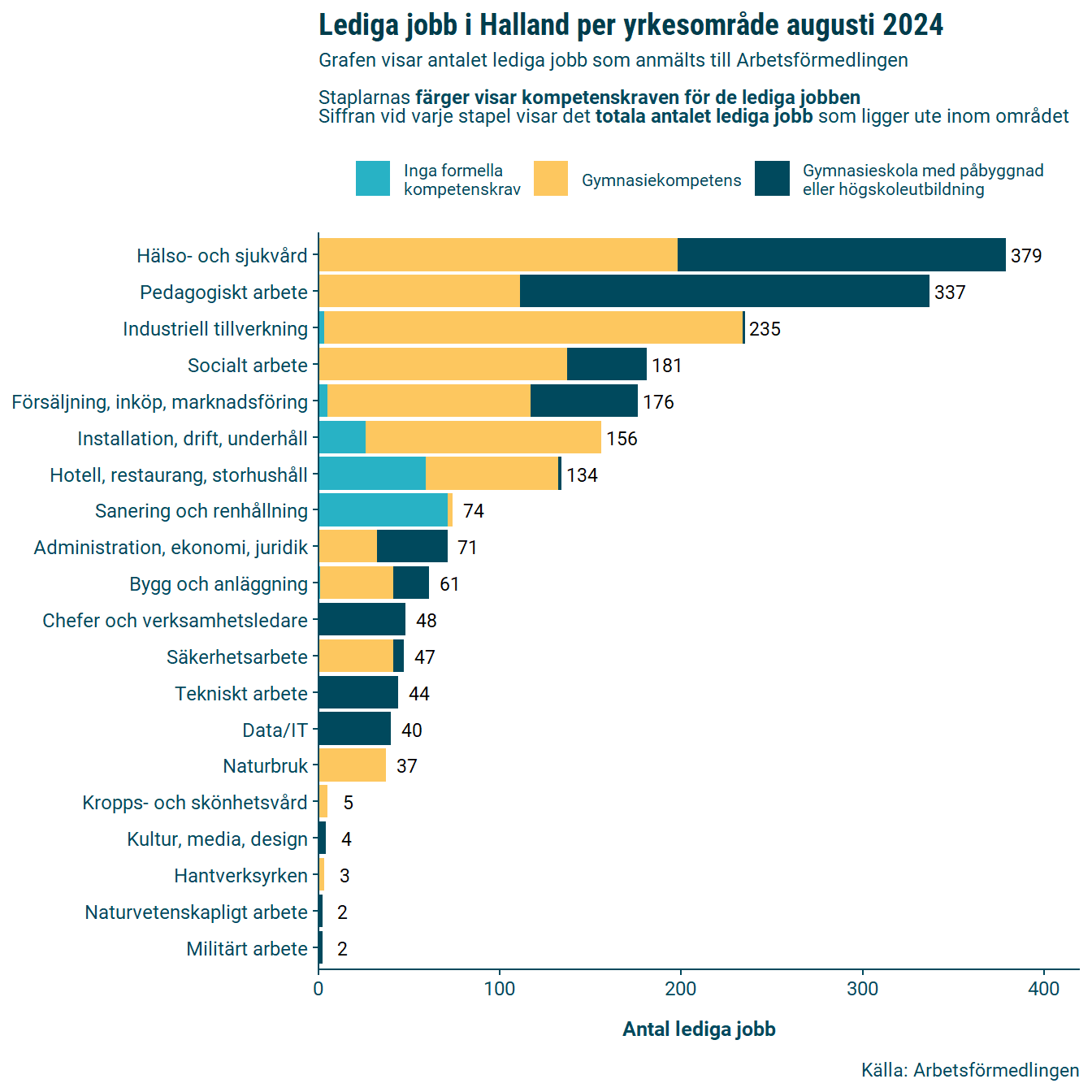Branschtillhörigheten visar vilken typ av verksamhet som arbetsgivaren huvudsakligen bedriver, men den säger nödvändigtvis inget om yrkesinnehållet. Ur detta perspektiv kan det vara mer relevant att se till antalet lediga jobb per yrkesområde. I dagsläget finns flest antal lediga jobb ute inom yrkesområdena hälso- och sjukvård, pedagogiskt arbete, samt industriell tillverkning.