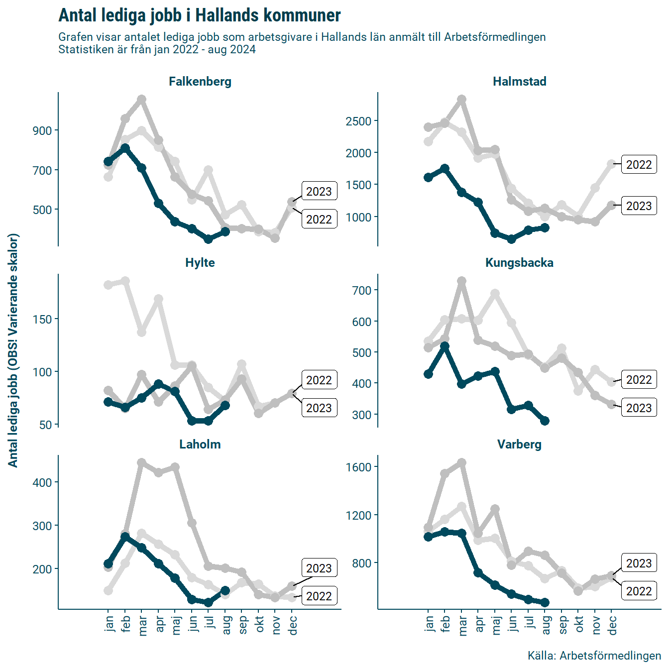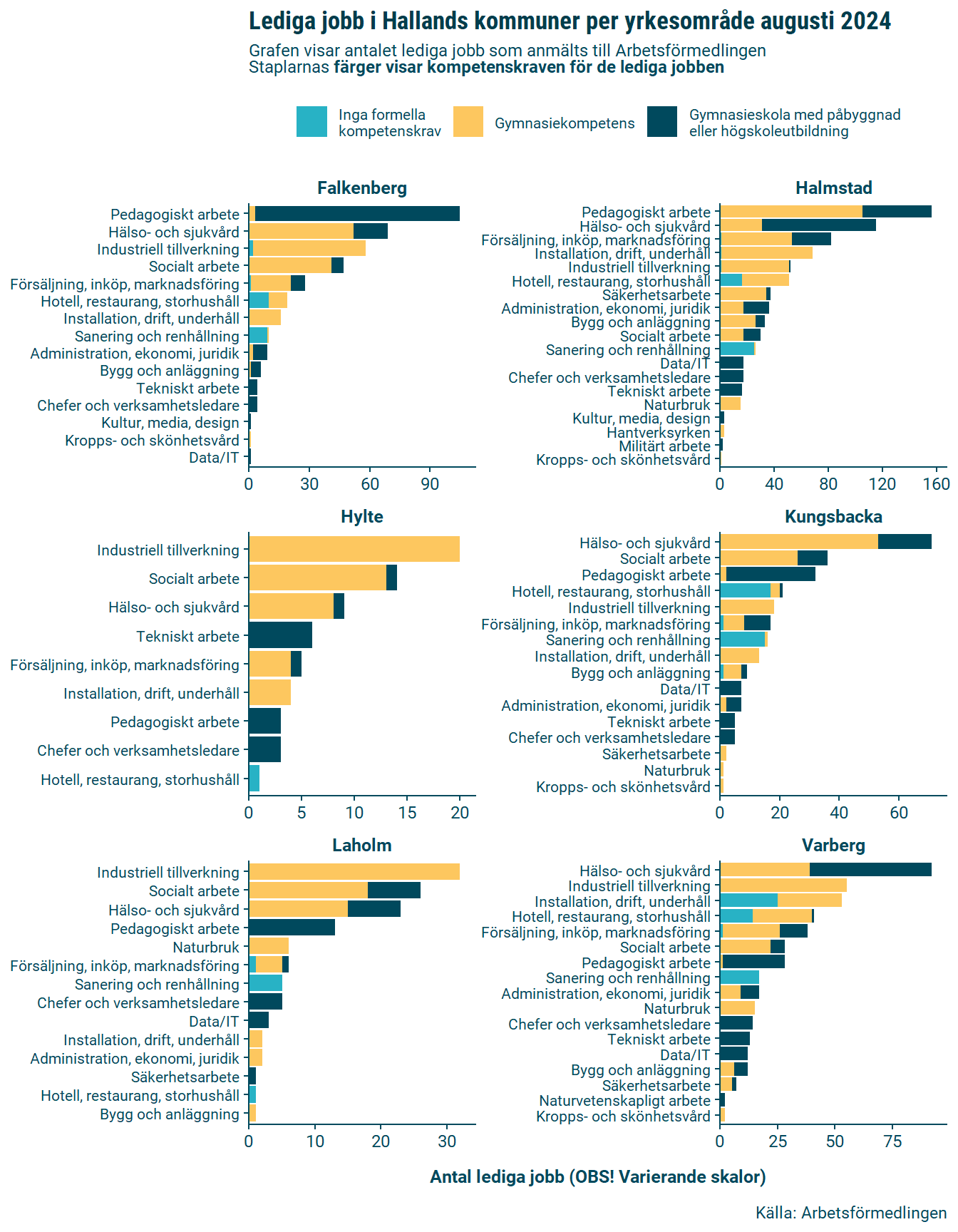 Antalet lediga jobb ger också en bild av hur efterfrågan skiljer sig inom olika branscher och yrkeskategorier. Men en svaghet med måttet är att vi aldrig kan få hela bilden över hur många lediga jobb det finns i samhället. Många arbetsgivare väljer att förmedla jobb via andra kanaler än Platsbanken. Vidare finns det en risk att vissa arbetsgivare har ett stort behov av att anställa men väljer att inte initiera någon sökprocess i och med svårigheter att hitta lämpliga sökande. Men en stor fördel med statistiken över lediga jobb är att den uppdateras med hög frekvens och därför, till skillnad från registerstatistik, kan ge oss en aktuell bild av vad arbetsgivare i Halland efterfrågar.