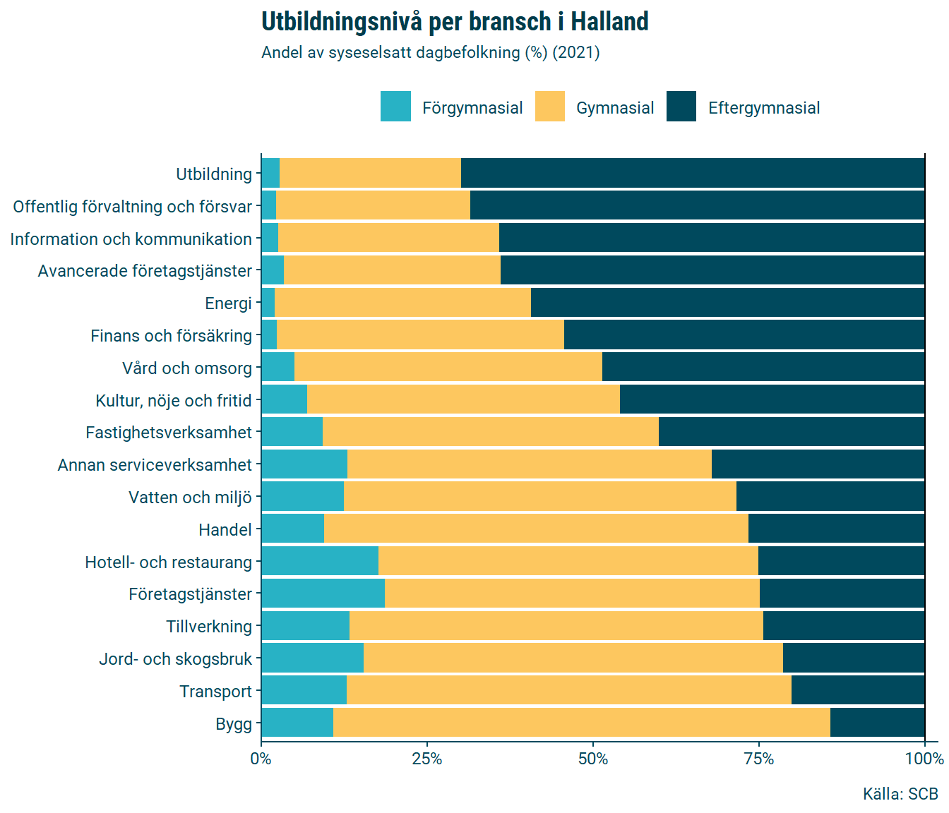 Branscherna i Halland har vitt skilda kompetensbehov; inom vissa av dem innehar en majoritet av de anställda en eftergymnasial utbildning, inom andra står förgymnasialt och gymnasialt utbildade för en stor del av personalförsörjningen. Variationerna beror på att yrkessammansättningen inom respektive bransch ser väldigt olika ut.