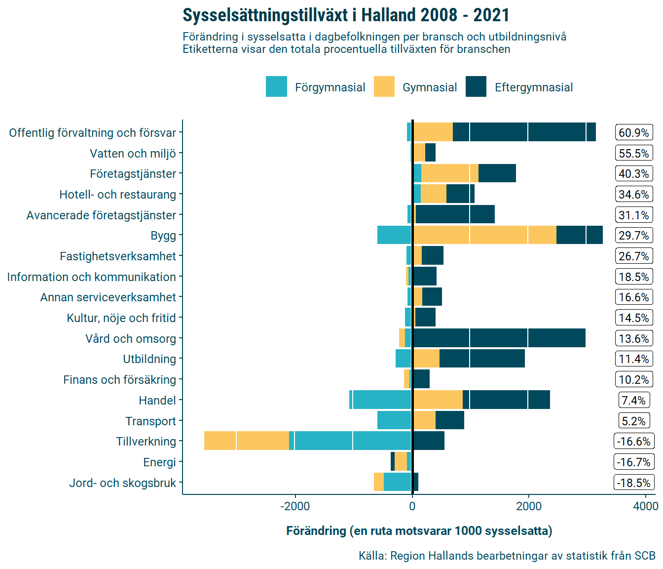 Under perioden 2008–2021 ökade antalet sysselsatta i Hallands län med 12,3 procent (14 620 personer). Detta var den femte högsta tillväxten i landet och endast Stockholm, Skåne, Uppsala samt Östergötland hade en högre tillväxttakt. Bakom nettosiffran döljer sig en förhållandevis omvälvande förändring på arbetsmarknaden under den här perioden. Nedbrutet på utbildningsnivå framkommer att antalet sysselsatta med en förgymnasial utbildning minskade kraftigt samtidigt som antalet sysselsatta med en gymnasial eller eftergymnasial utbildning ökade markant. Utifrån ett utbildningsperspektiv ökade således kunskapsinnehållet på länets arbetsmarknad under denna period. Man kan också uttrycka det som att, utifrån ett utbildningsperspektiv, trösklarna in till arbetsmarknaden har höjts.
