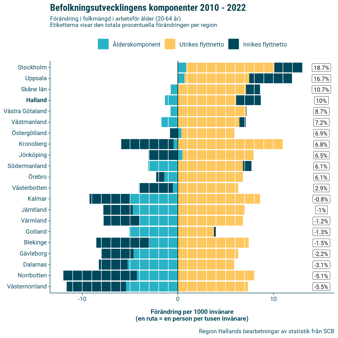 Komponenterna bakom arbetskraftstillväxten varierar stort mellan landets regioner. I samtliga län är det invandringen som har bidragit mest till arbetskraftstillväxten och utan den hade antalet invånare i arbetsför ålder minskat under perioden, vilket beror på generationseffekter. Av länen är det endast i ett fåtal där inrikes inflyttning och ålderskomponenten bidragit till arbetskraftstillväxten under perioden. Detta innebär att det sker en omflyttning av arbetskraft mellan Sveriges regioner, varav Hallands län är en av nettovinnarna. Gemensamt för de regioner som attraherar arbetskraft från andra län är att de, med undantag för Gotland, är storstadsregioner eller grannregioner till dem.