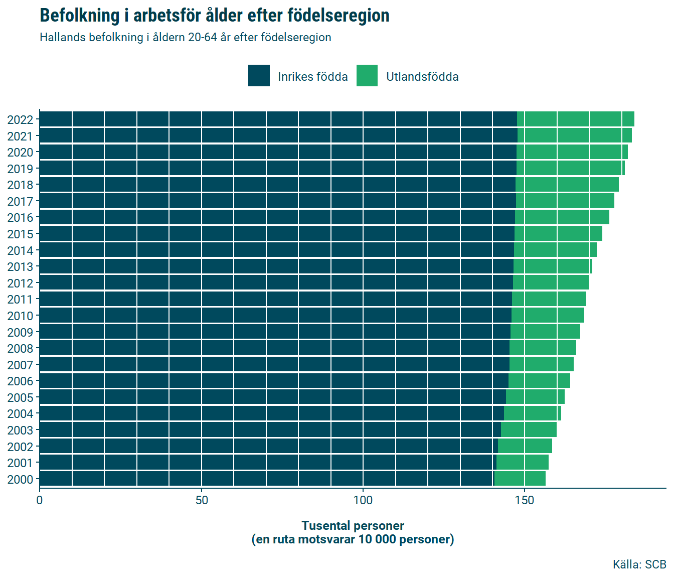 Utvecklingen har inneburit att arbetskraftens sammansättning förändrats – år 2000 var 14 procent av befolkningen i arbetsför ålder födda i ett annat land än Sverige, år 2022 hade andelen ökat till drygt 27 procent. I faktiska tal har antalet utlandsfödda i arbetsför ålder boendes i Sverige mer än fördubblats under 2000-talet.
