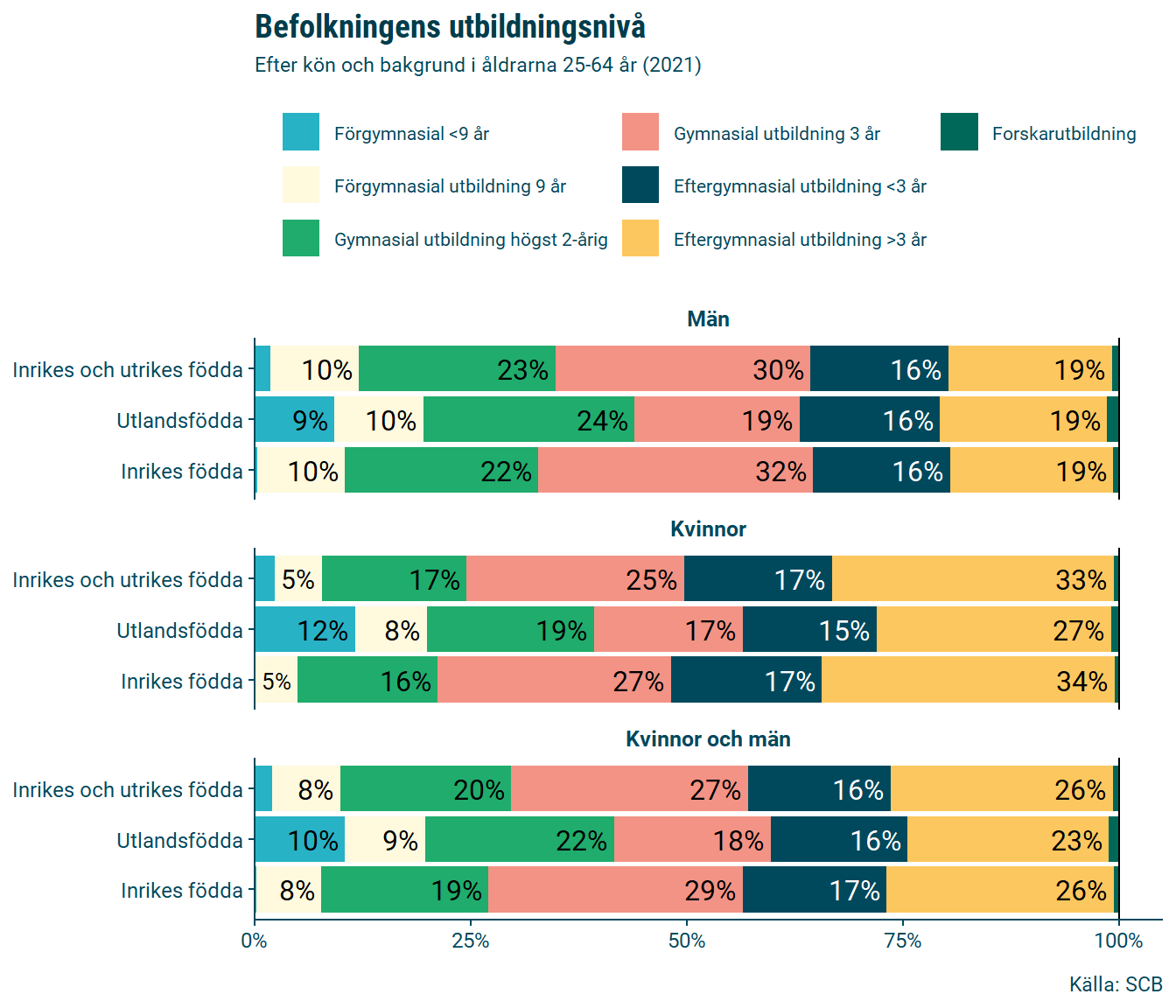 Det är betydligt fler kvinnor än män som har en eftergymnasial utbildning, särskilt en längre sådan. Bland utlandsfödda är det en relativt sett stor andel som saknar en gymnasial utbildning, vilket försvårar möjligheterna att inträda på arbetsmarknaden.