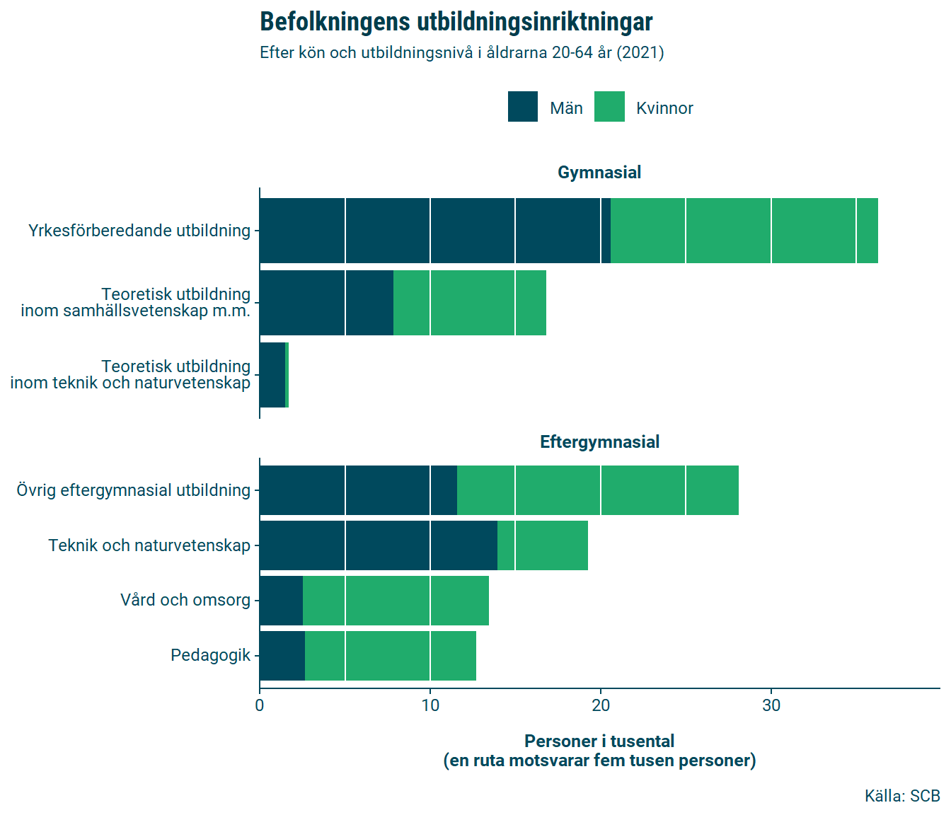 Män är som mest överrepresenterade inom utbildningar med tekniskt innehåll, såsom bygg- och fastighet, fordon- och logistik, naturvetenskap och IT samt teknik och tillverkning. Gemensamt för dessa utbildningsinriktningar är att de främst resulterar i ett yrke inom den privata sektorn. Som vi tidigare har sett i denna rapport leder de könsuppdelade studievalen i förlängningen till en könsuppdelad arbetsmarknad. För att på sikt ta tillvara alla individers förmågor och intressen är det därför viktigt att främja studieval utifrån intresse och motverka val som görs utifrån könsnormer (Jämställdhetsmyndigheten, 2022).