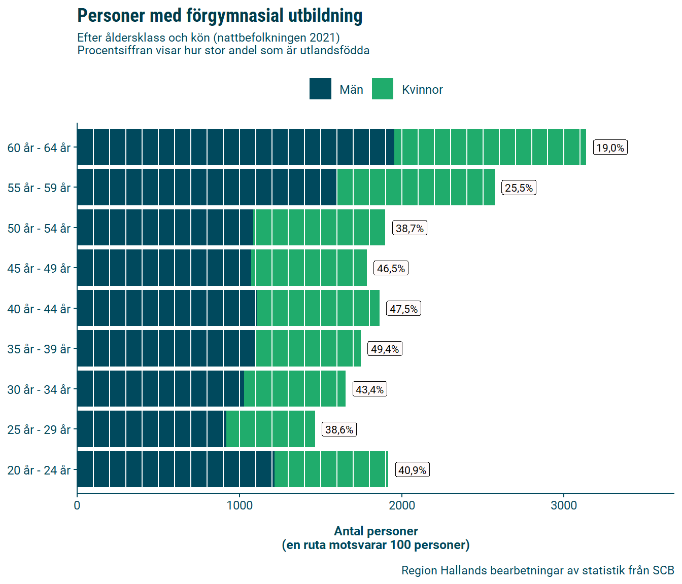 Uppdelat på kön framkommer att det är fler män än kvinnor som saknar en gymnasial utbildning. Detta hänger samman med att pojkar överlag har sämre studieresultat men också att män i högre utsträckning än kvinnor innehaft yrken som tidigare inte har krävt en gymnasial utbildning. Denna typ av yrken har över tid blivit allt färre och vid utgången av 2020 fanns det drygt 7 500 yrken i Hallands län som enligt yrkesregistret endast hade en kortare utbildning som kompetenskrav. Med andra ord är utbudet av förgymnasial kompetens betydligt större än de yrken som finns tillgängliga för gruppen. Vidare konkurrerar, av olika anledningar, ofta andra utbildningsgrupper om dessa yrken.