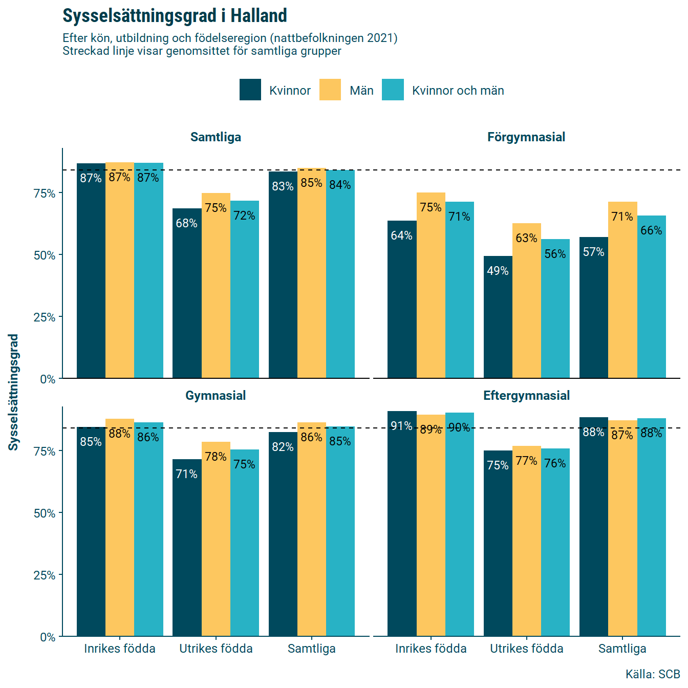 Hallands län har en hög sysselsättningsgrad jämfört med andra regioner men det råder stora variationer när vi ser till utbildningsnivå, kön och födelseregion.