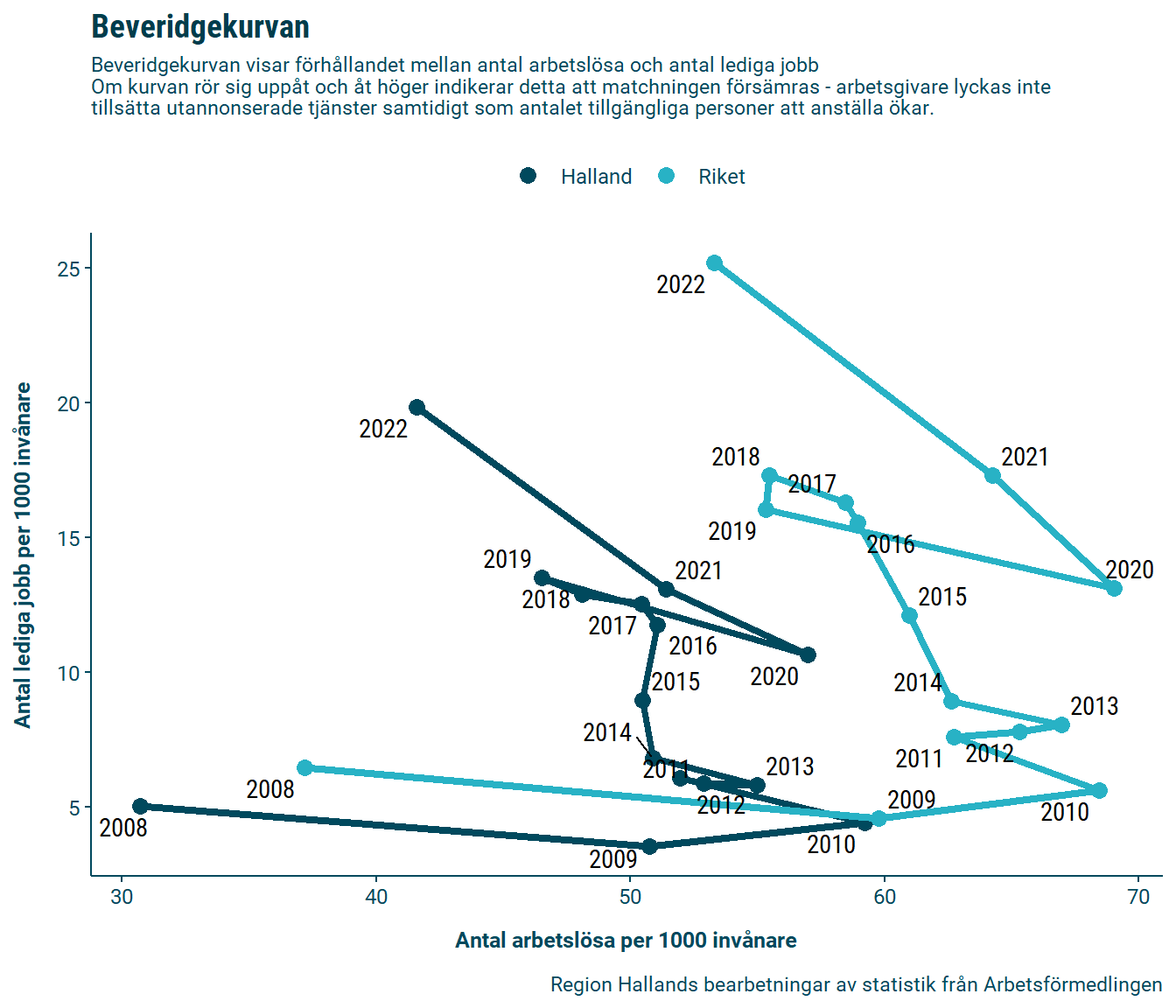 Både i Halland och Sverige har matchningen, enligt detta sätt att mäta, försämrats sedan finanskrisen. I samband med finanskrisen steg arbetslösheten i en hög takt som följd av konjunkturnedgången. Utvecklingen följdes sedan upp av en hög asylinvandring som kom att påverka inflödet av arbetssökande personer. Under 10-talet skedde inga dramatiska skiftningar likt under finanskrisen, men 20-talet inleddes med en ökad arbetslöshet och ett färre antal lediga tjänster i samband med att coronapandemin briserade. Återhämtningen efter pandemin har sedan präglats av en mycket låg arbetslöshet och ett historiskt högt antal lediga jobb, vilket vittnar om en tämligen stark arbetsmarknad med hög efterfrågan på arbetskraft. Men både arbetslöshetsnivån och antalet lediga tjänster ligger fortsatt på en högre nivå jämfört med 2008.