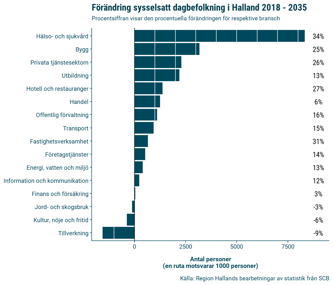 Fram till 2035 förväntas antalet sysselsatta i Hallands län (dagbefolkningen) att öka med drygt 20 000 personer. Drygt hälften av sysselsättningstillväxten prognosticeras att ske inom den offentliga sektorn (vård, utbildning och offentlig förvaltning).