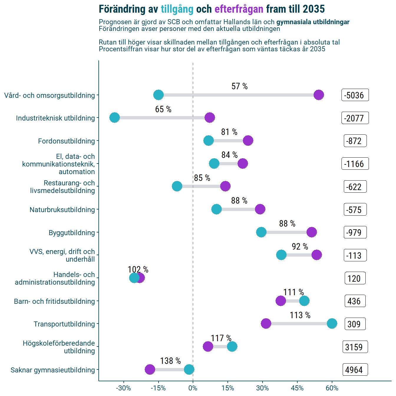 I relativa tal förväntas efterfrågan på gymnasialt utbildade växa som mest inom vård och omsorg, bygg, samt VVS, drift, energi och underhåll. Samtidigt väntas det råda ett stort överskott på de som har högskoleförberedande gymnasieutbildning som högsta utbildningsnivå. Det väntas även råda ett överskott på drygt 5000 individer som saknar gymnasial utbildning, en grupp som generellt har en svag ställning på arbetsmarknaden.