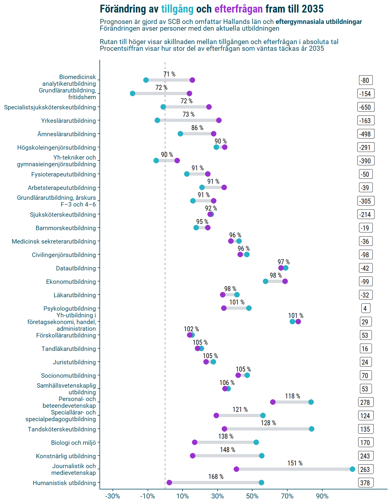 Inom vissa eftergymnasiala utbildningar visar prognosen att det kommer råda balans mellan tillgång och efterfrågan till 2035, samtidigt som bedömningen är att det råder en bristsituation idag. Det är därför ett rimligt antagande att denna bristsituation kommer kvarstå 2035, i de fall tillgången inte ökar mer än efterfrågan under prognosperioden. Detta rör bland annat högskoleingenjörer och civilingenjörer. Bland de eftergymnasiala utbildningarna väntas överskotten på utbildade vara som störst inom konst, humanistisk utbildning och journalistik.