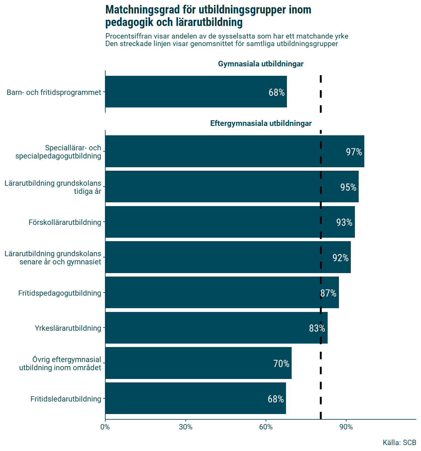 Matchningsgraden visar hur stor andel av de som är sysselsatta som har ett arbete som helt eller delvis stämmer överens med deras utbildningsinriktning och utbildningsnivå. Måttet skiljer sig därför från sysselsättningsgrad som endast visar om en person har ett arbete eller inte. Matchningsgraden inom pedagogik och lärarutbildning är 85.6 procent, vilket är en högre nivå än för samtliga utbildningsgrupper i länet (80.5 procent).