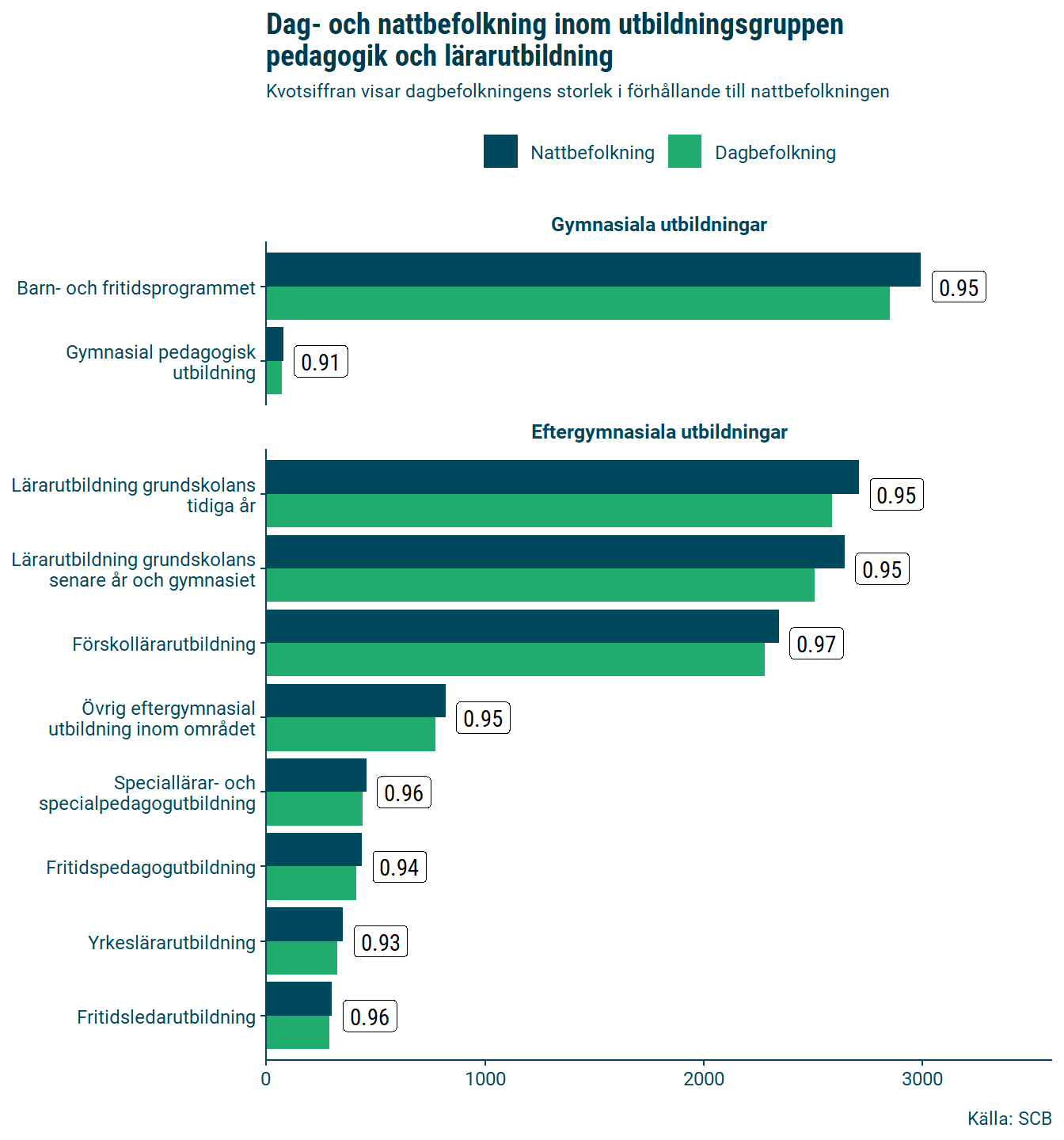 Den sysselsatta nattbefolkningen inom utbildningsområdet pedagogik och lärarutbildning är 13134 personer, att jämföra med dagbefolkningen som är 12539 personer. Det betyder att det är färre som pendlar in till länet än som pendlar ut inom denna utbildningsgrupp.