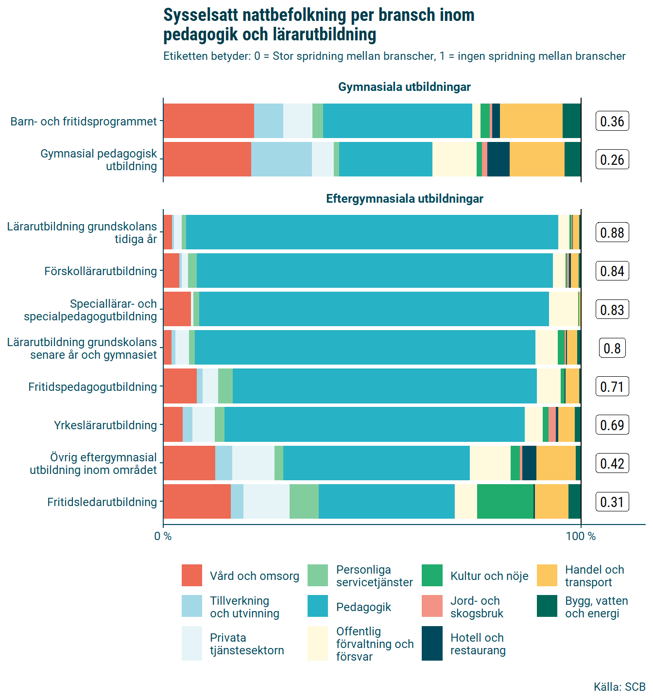 Olika utbildningsgrupper är verksamma inom olika branscher och beroende på vilken utbildning vi studerar varierar branschspridningen. En del utbildningar sprider sig över flera olika branscher medan andra är koncentrerade till ett fåtal. Att spridningen mellan branscherna varierar stort beror på en mängd olika faktorer.