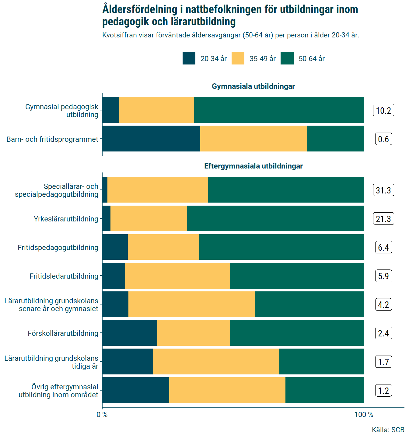 Det är viktigt att studera ålderssammansättningen inom olika utbildningsområden för att få en uppfattning om gruppens demografiska balans. Om en hög andel utbildade inom en utbildningsinriktning väntas att gå i pension samtidigt som andelen unga med utbildningen är få finns en risk för att arbetskraftstillgången på sikt minskar.