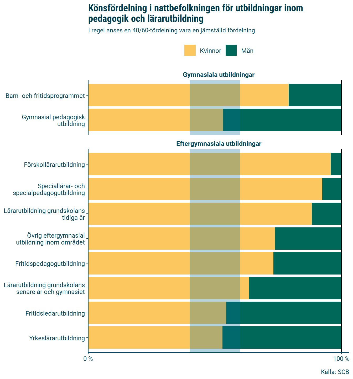 Det finns fler kvinnor än män inom utbildningsgruppen. Endast tre utbildningsinriktningar inom fältet har en representativ könsfördelning.