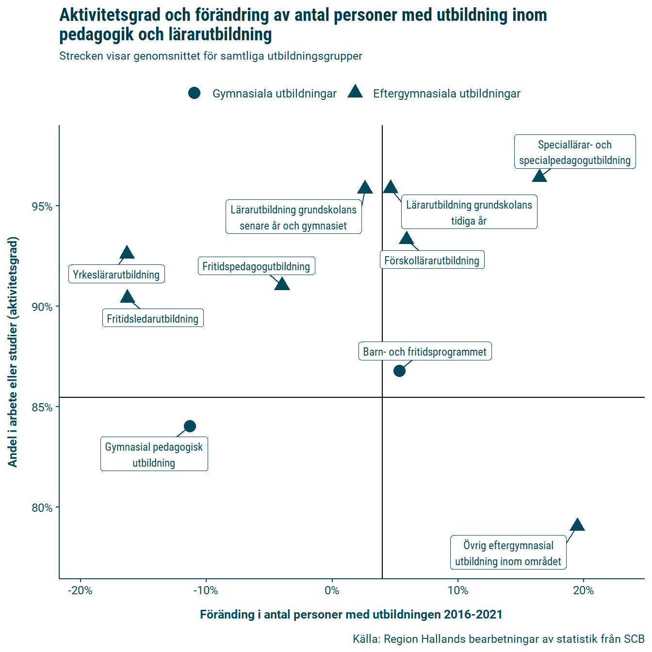Det bor 14454 personer i Hallands län med en utbildning inom pedagogik och lärarutbildning. Detta utgör 7.9 procent av alla personer mellan 20-64 år och som bor i regionen. Totalt är 90.9 procent av personerna i utildningsgruppen i sysselsättning. Detta är över genomsnittet (83.2 procent) för samtliga utbildningsgrupper i länet. I riket uppgår sysselsättningsgraden för utbildningsgruppen pedagogik och lärarutbildning till 89.1 procent, detta innebär att gruppen har en bättre arbetsmarknadsställning i Hallands län än i riket som helhet.