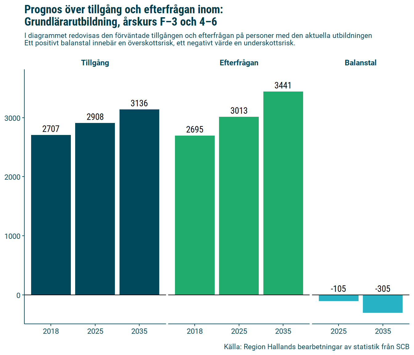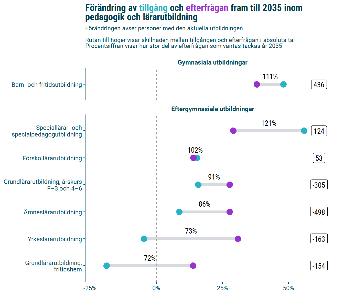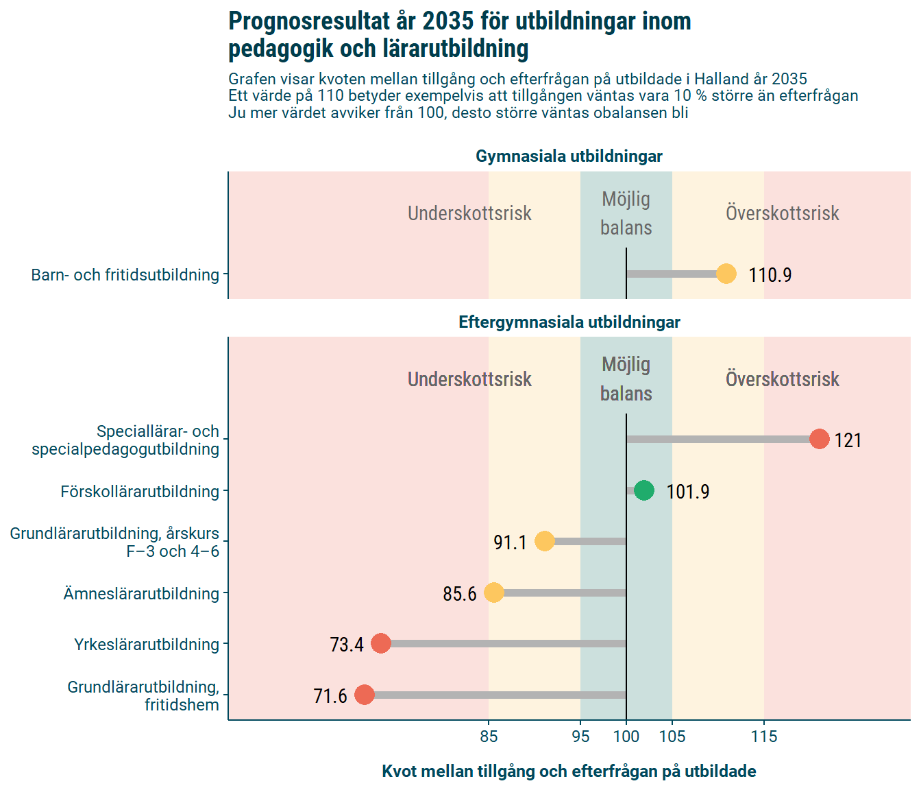 2035 bedöms det finnas risk för brist inom fyra utbildningsinriktningar: Ämneslärarutbildning, yrkeslärarutbildning, grundlärarutbildning med inriktning mot fritidshem, samt grundlärarutbildning riktad mot förskoleklass upp till årskurs 6.
