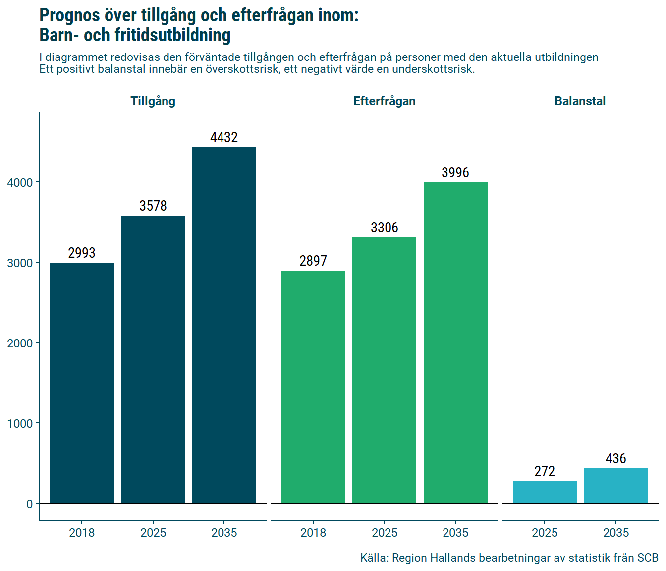 Både efterfrågan och utbudet på gymnasialt utbildade inom barn- och fritid förväntas att öka kraftigt under prognosperioden. Den ökade efterfrågan beror framför allt på den utbildningsväxling som väntas fortsätta under prognosperioden. Den innebär att en större andel av dem som arbetar som barnskötare och elevassistenter på sikt antas ha barn- och fritidsutbildning. Dessutom ökar behovet av personal inom förskola och vård och omsorg. Prognosen pekar dock på att antalet utbildade kommer att öka mer än efterfrågan, vilket leder till en prognosticerad överskottsrisk 2035.