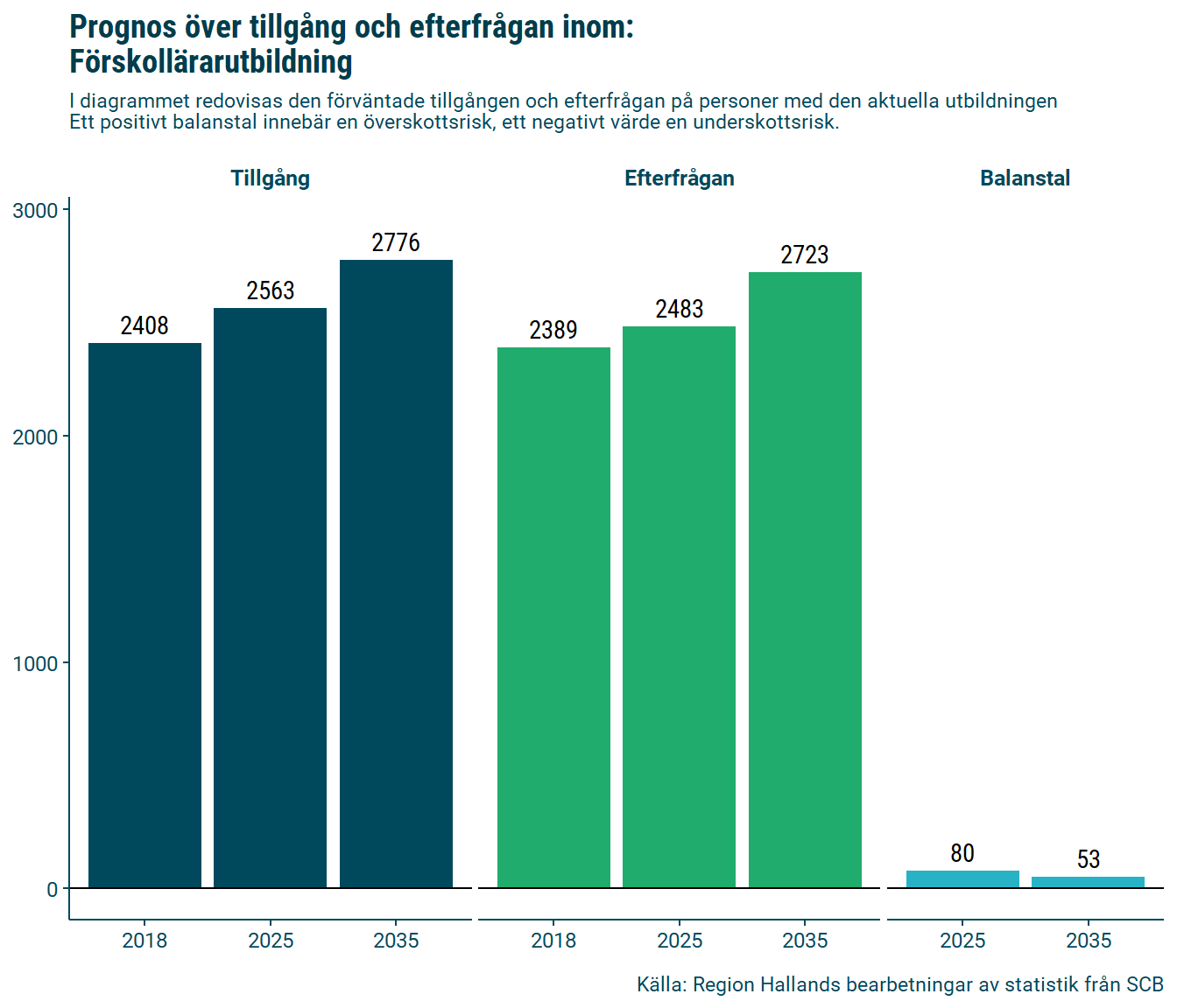 När det gäller förskollärare visar prognosen att läget förväntas vara förhållandevis balanserat 2035, vilket beror på att tillgången förväntas att öka mer än efterfrågan. Den prognosticerade utbudsmarginalen är dock liten, vilket innebär att mindre förändringar kan komma att förändra utfallet. Att efterfrågan förväntas att öka på förskollärare beror dels på att antalet anställda inom utbildningssektorn förväntas att öka, dels på att andelen utbildade förskollärare inom förskolan förväntas att öka.