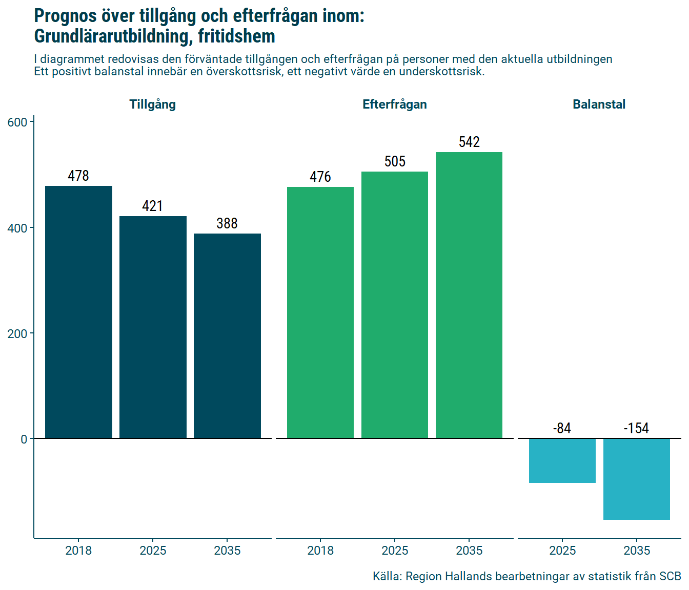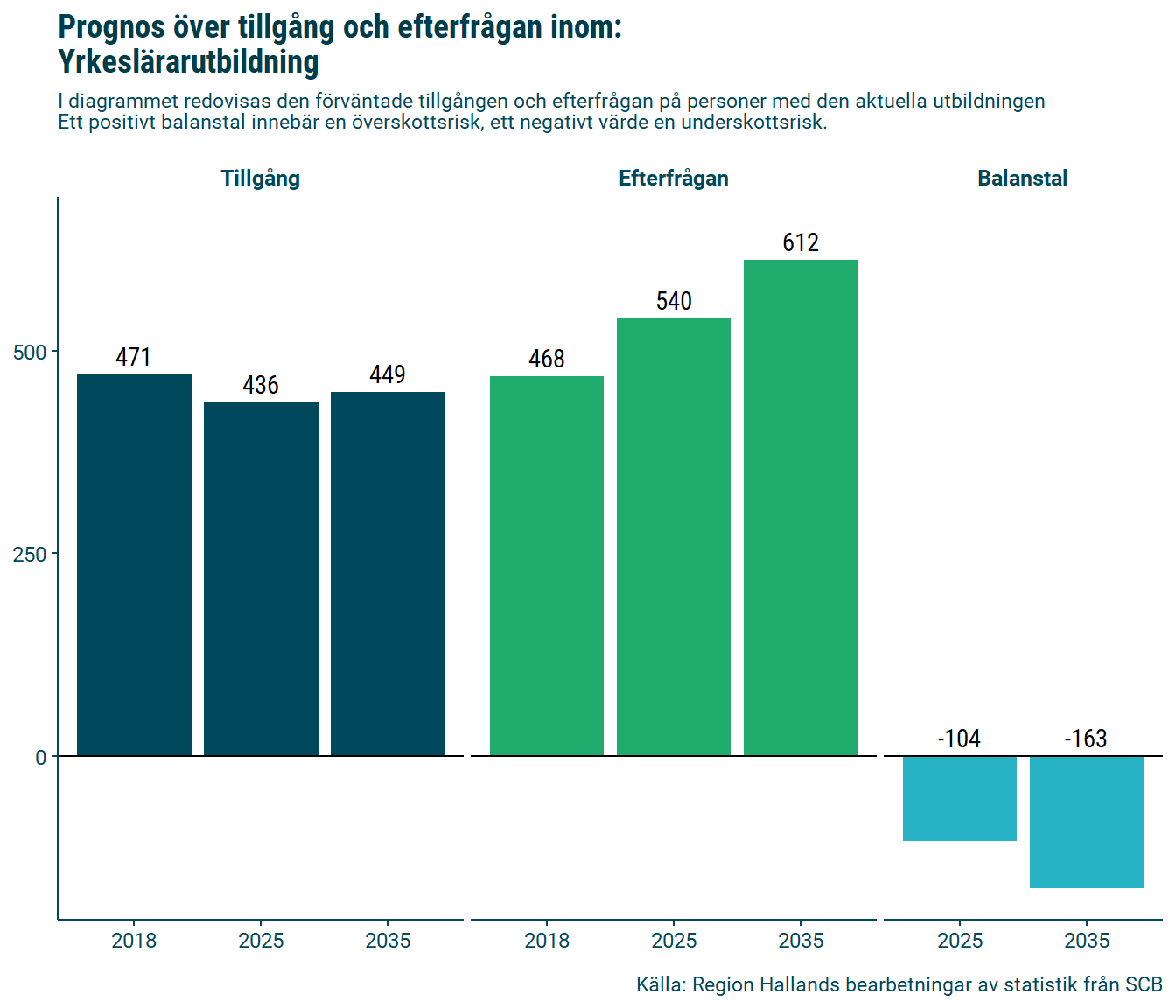 Det är framför allt utvecklingen av antalet barn och ungdomar i befolkningen som styr behoven av personal och kompetens i förskolan och skolan. De senaste åren har en kraftig förändring skett nationellt och istället förväntas antalet barn och unga minska något i jämförelse med tidigare prognoser. Vuxenutbildningens personal- och kompetensbehov påverkas i stor utsträckning av invandring. Majoriteten av dem som läser komvux på grundläggande nivå är utrikes födda. Samtidigt är det utvecklingen av befolkningen i arbetsför ålder som sätter ramarna för tillgången till personal i förskola, skola och vuxenutbildning. Halland har här en positiv utveckling. Skolverkets senaste lärarprognos visar att behoven inte längre ökar lika snabbt och i lika stor utsträckning som man tidigare trott. Prognosen visar också att arbetsgivare lyckats behålla och rekrytera medarbetare till skolan och förskolan. Det är också fler nyexaminerade lärare som går direkt till arbete i skolan än vad tidigare prognoser visat (SKR, 2022a).