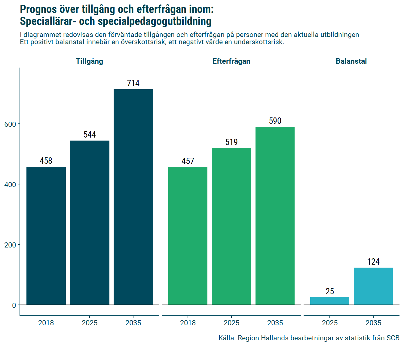 Det finns risk för överskott på personer med speciallärar- och specialpedagogutbildning, samt gymnasial barn- och fritidsutbildning.