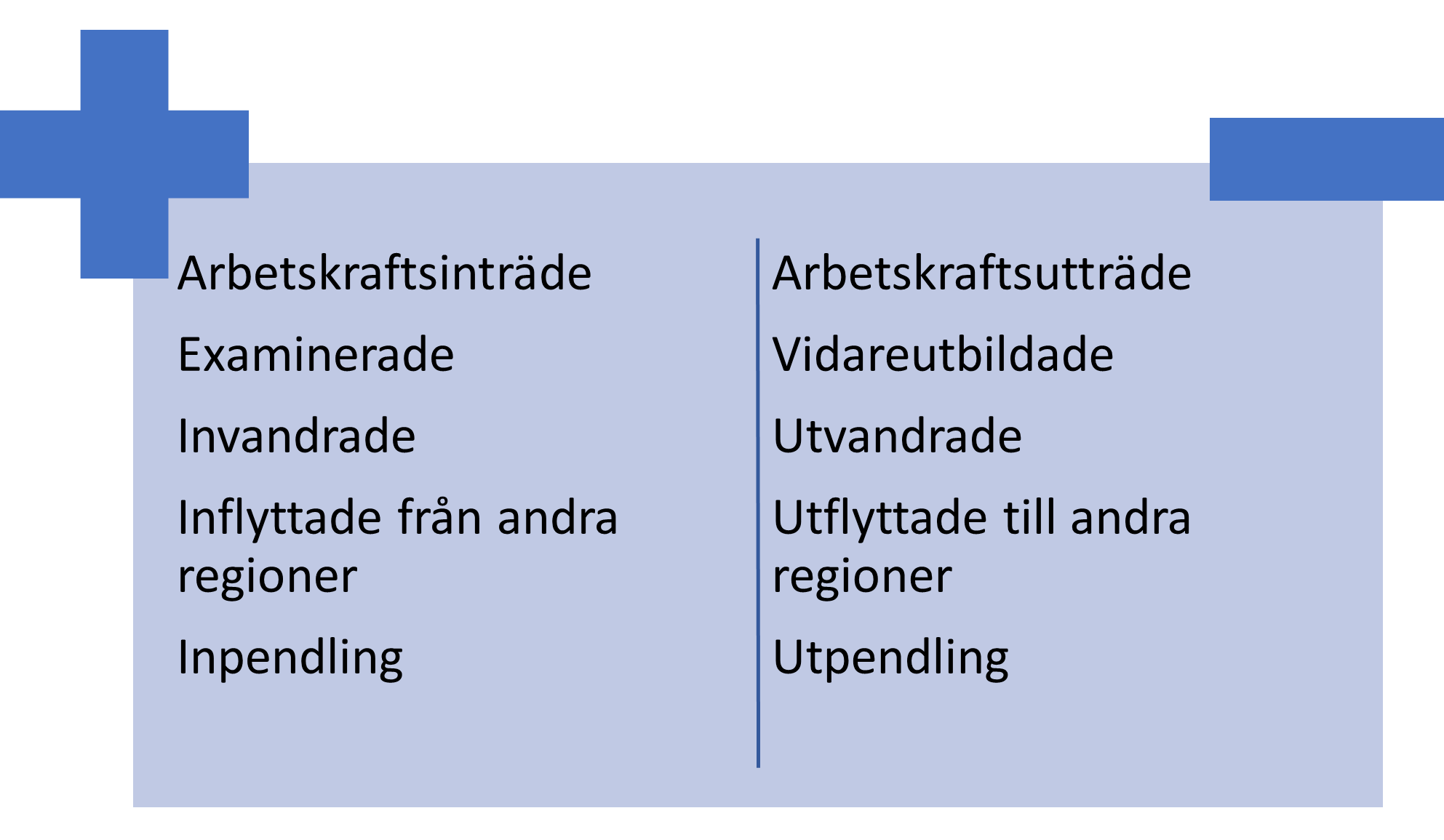 Tillgången på en viss utbildningsgrupp i länet är resultatet av flera olika flöden som visas i modellen nedanför. Att notera är att tillgången beräknas utifrån arbetskraftsutbudet. Med arbetskraft avses personer som är i) i sysselsättning och ii) inskrivna som arbetslösa. Personer som är i arbetsför ålder men som av olika anledningar inte är tillgängliga för arbetsmarknaden ingår således inte i den beräknade tillgången. Konkret innebär detta att personer som exempelvis är i sjukskrivna, i studier eller förtidspensionerande inte anses tillhöra tillgången. Detta beror på att de helt enkelt inte är tillgängliga för arbetsmarknaden.